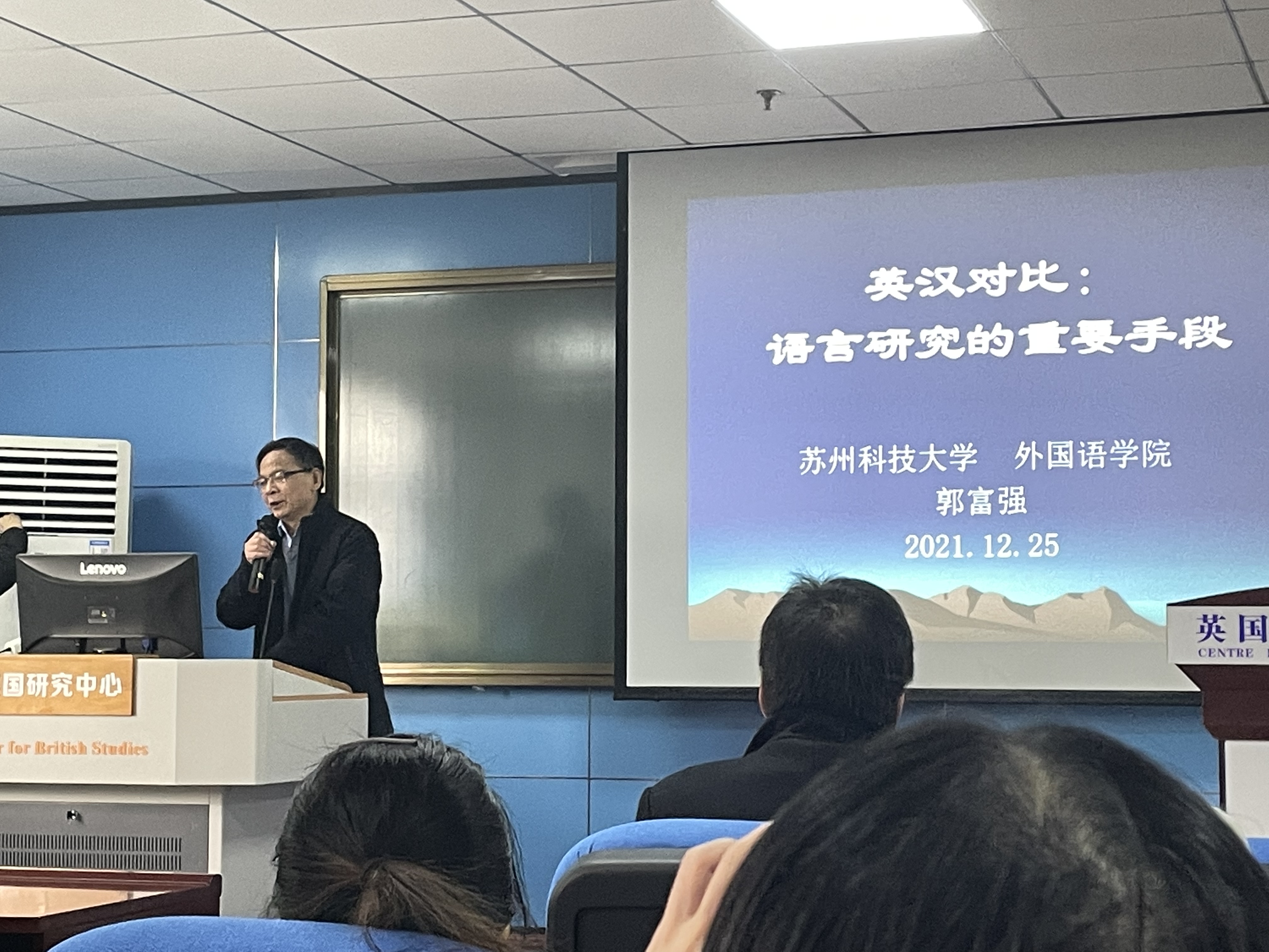 郭富强教授首先讲述了对比语言学和比较语言学的起源,他强调对比语言学主要是对语言进行共时研究,通过比较不同语言之间在语音、词汇、语法、修辞等方面的异同,尤其是“异”,寻找语言的变换以及干扰等,为语言教授、语言翻译等服务。郭教授指出对比分析作为学习和研究的手段,学会了一种方法就获得了更大的主动权,尤其对于语言学者、研究者和英语学习者很有必要。对比就是翻译的基础,知其然还要知其所以然。有对比就有翻译,有翻译就有对比。最后,他建议老师们要对语法教学重视起来,要对语言具有敏感能力。