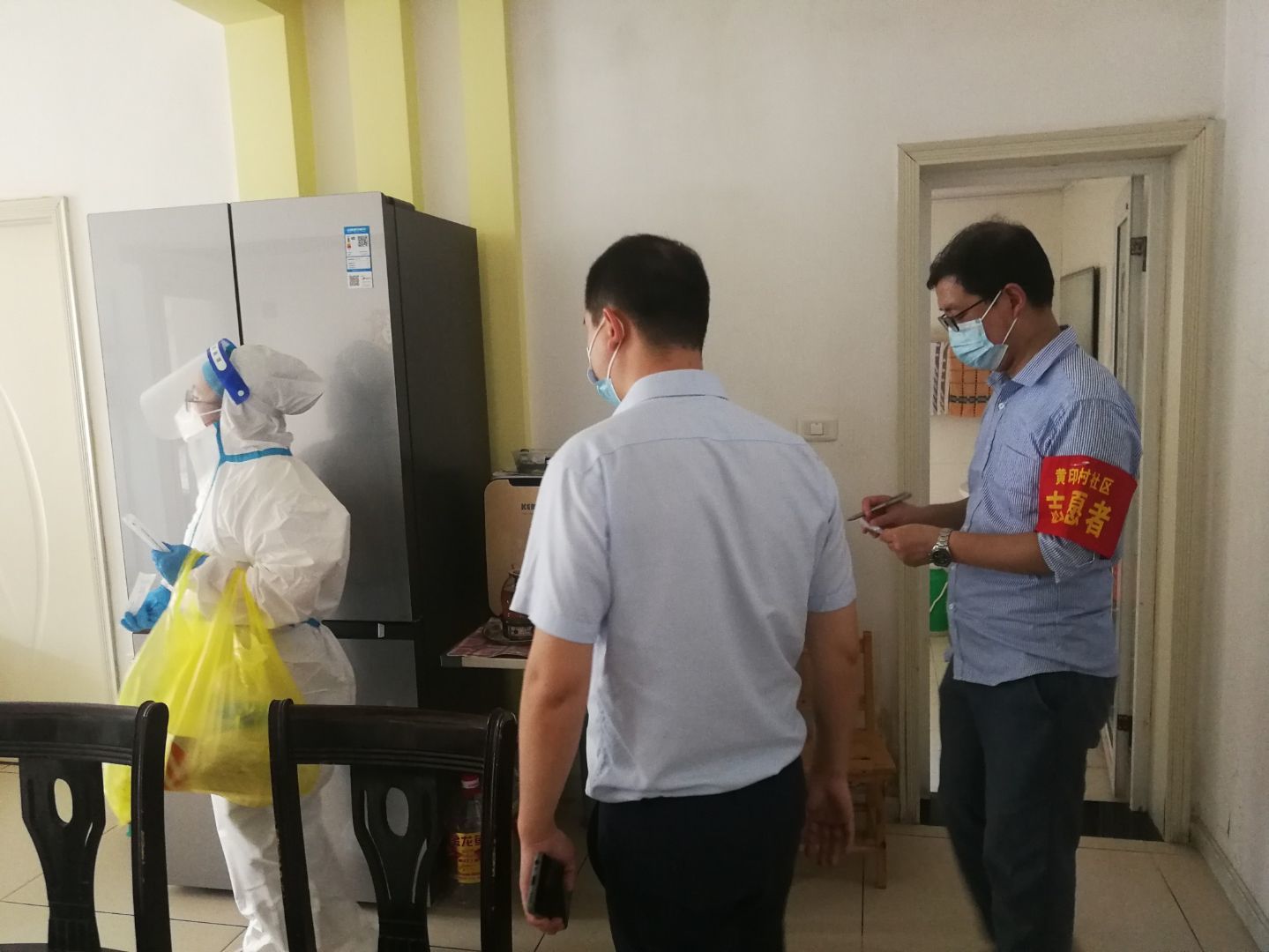 (支部党员杨钢同志,协助医护人员,针对居家隔离人员和行动不便的老年人、残疾人等特殊群体,主动上门采样)