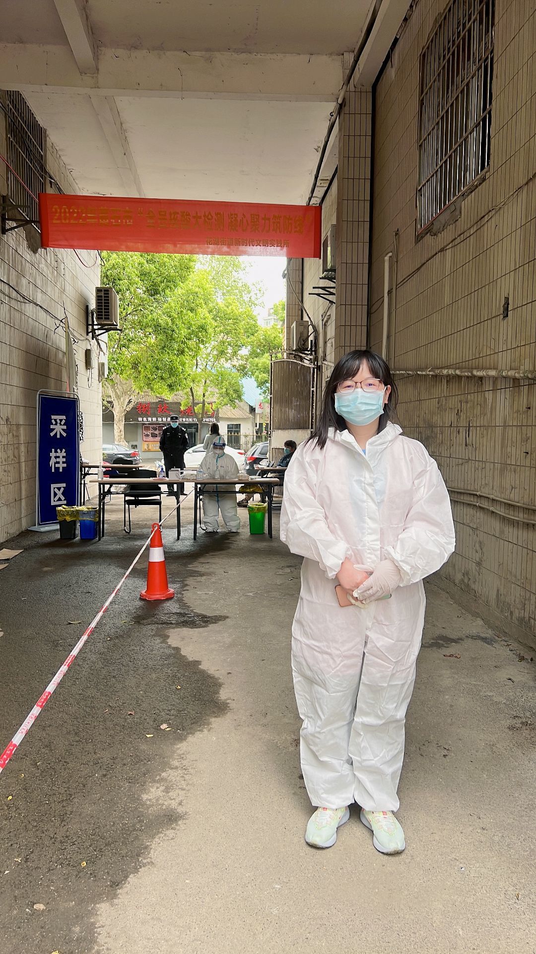 (支部党员刘敏同志在采样区对前来检测的居民登记)