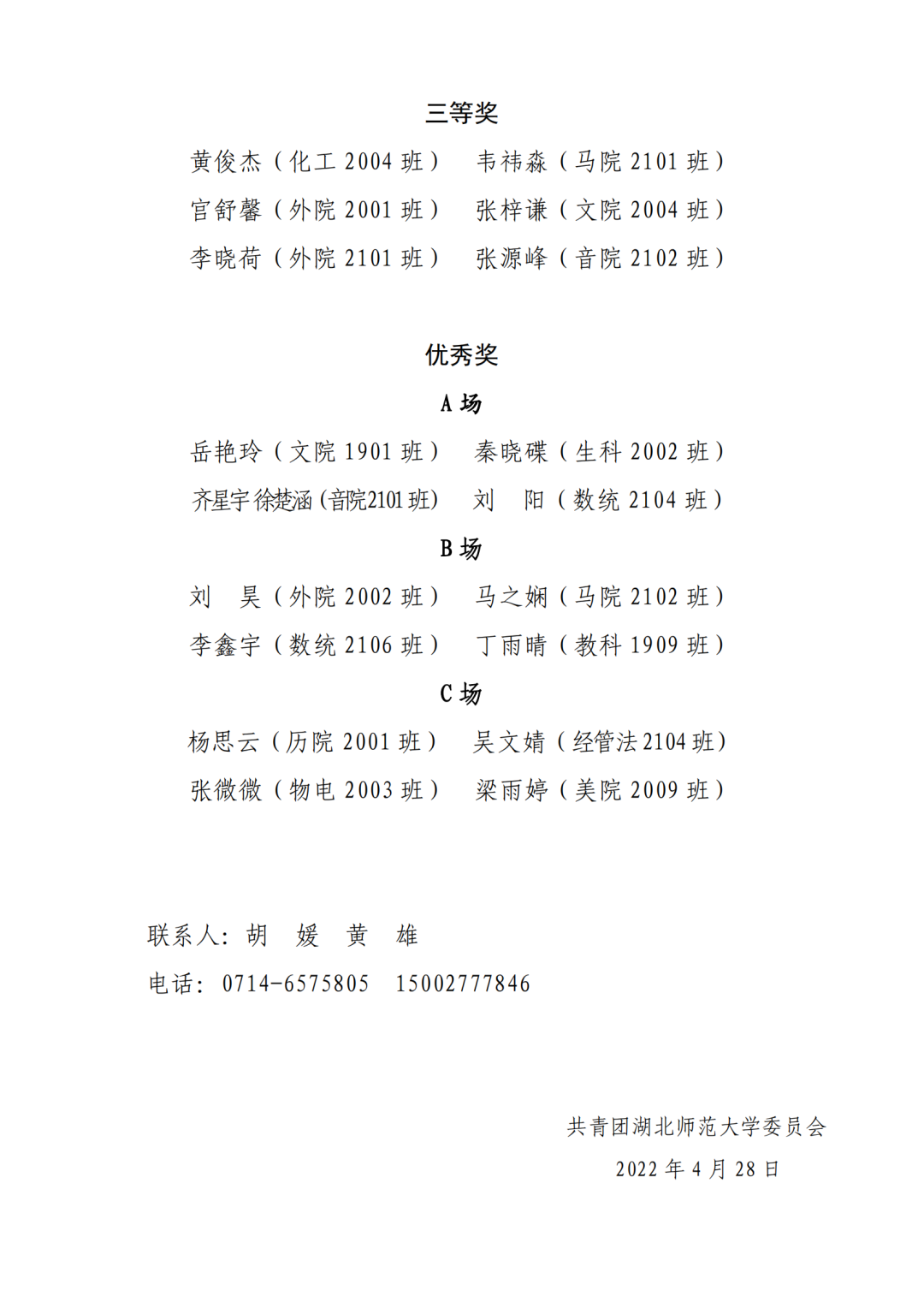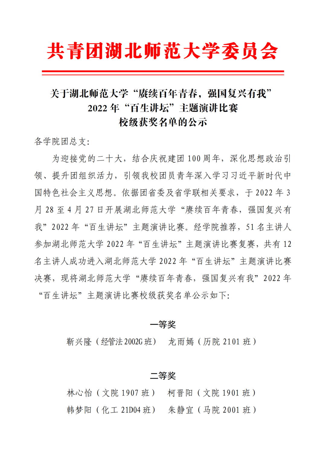 为庆祝中国共青团百年华诞,提高广大湖师青年的思想政治水平,在全校团学组织中持续深化“百生讲坛”——学习宣传贯彻习近平新时代中国特色社会主义思想活动,4月27日晚,第一会所 在教育大楼报告厅举行了以“赓续百年青春,强国复兴有我”为主题的“百生讲坛”演讲比赛。经层层评选,外院入围决赛并取得优异成绩:2001班宫舒馨、2101班李晓荷荣获三等奖!