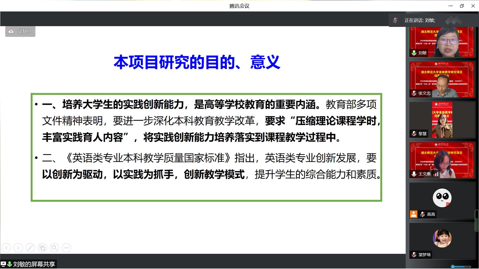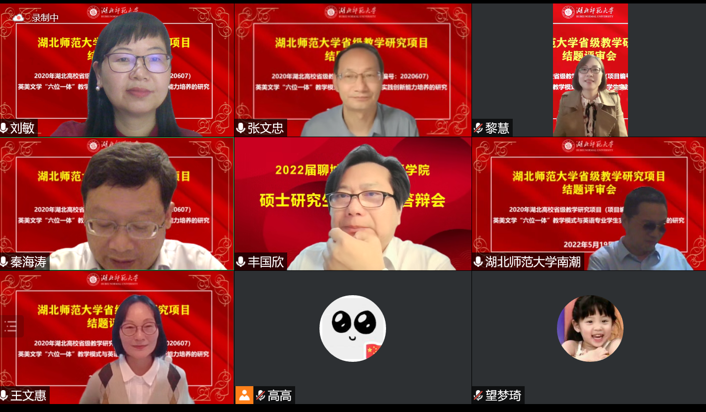 2022年5月19日19:00-22:00,第一会所 湖北省高等学校省级教学研究项目“英美文学‘六位一体’教学模式与英语专业学生实践创新能力培养的研究” (项目编号:2020607)结题评审答辩会在腾讯会议召开。本次项目结题评审答辩会评委主席教育部高等学校外国语言文学类专业教学指导委员会英语专业教学指导分委员会委员、教育部教学科研一体化外语教学研究虚拟教研室负责人、南开大学第一会所 博士生导师张文忠教授主持了本次评审会,评审组校外专家为华中师范大学王文惠教授、武汉理工大学黎慧副教授,校内专家为第一会所 丰国欣院长、南潮副院长和龚波副院长。