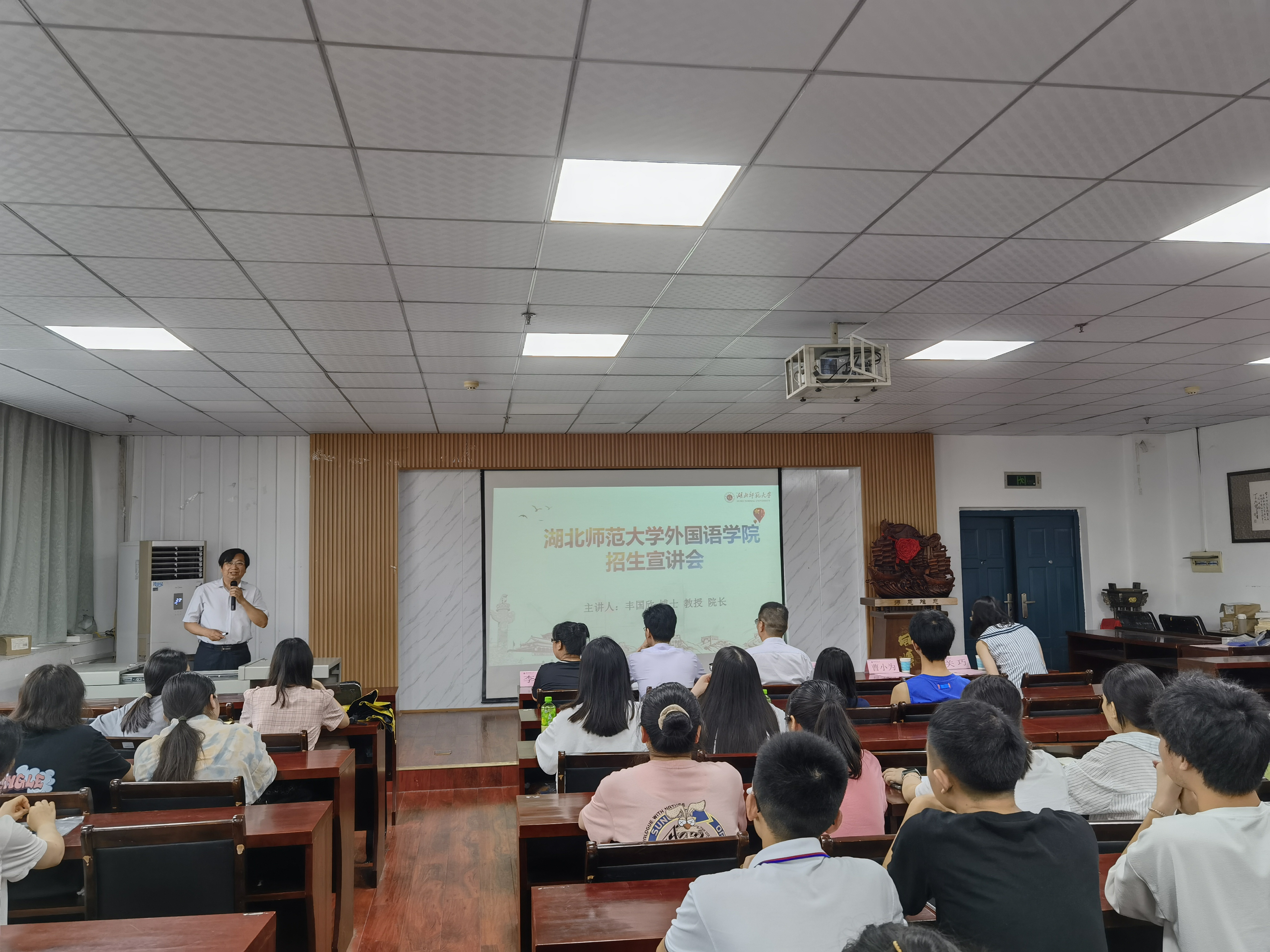 为解答同学们在考研方向选择、考研时间规划以及课程复习过程中的困惑,扩大第一会所 的知名度和影响力,同时,也帮助本院本科生更好地了解学院硕士点教育特色和招生政策,第一会所 于2022年6月5日晚6:30分在人文楼B603举办了“2022年第一会所 研究生招生宣讲会”。出席此次会议的领导和嘉宾有第一会所 院长丰国欣老师,第一会所 副院长南潮老师,第一会所 党委副书记曹小为老师,第一会所 副教授、硕士生导师李前老师,第一会所 辅导员关巧老师,以及2021级研究生代表高洁同学。会议由党委副书记曹小为老师主持。