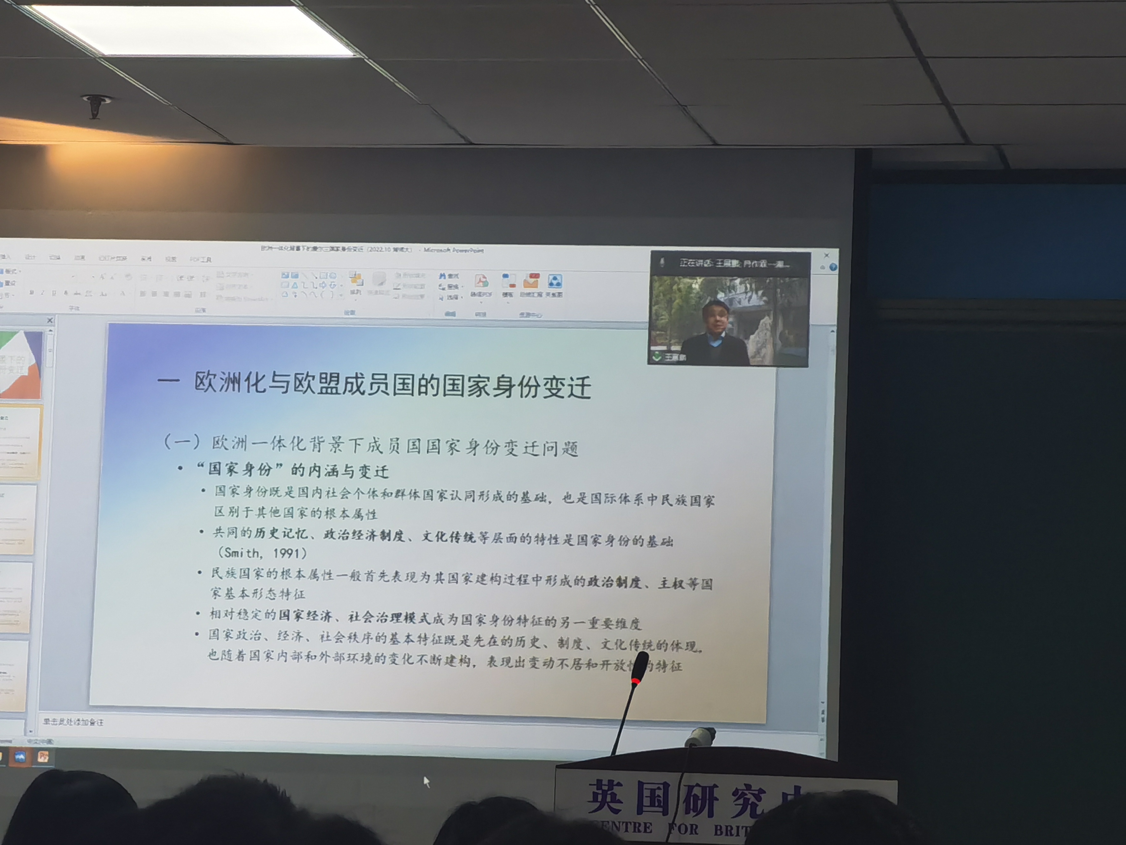 为营造浓厚科研氛围,鼓励广大教师加强学术交流,产出更多科研成果,我院和英国研究中心于2022年10月23日开展了“磁湖学术活动日——磁湖讲堂”系列活动。北京外国语大学英语学院副院长、博士生导师王展鹏教授,通过腾讯会议平台作了题为“欧洲一体化背景下的爱尔兰国家身份变迁”的第一场学术讲座。本次讲座由第一会所 副院长南潮教授主持,第一会所 院长丰国欣教授、第一会所 部分教师和硕士研究生聆听了本次讲座。