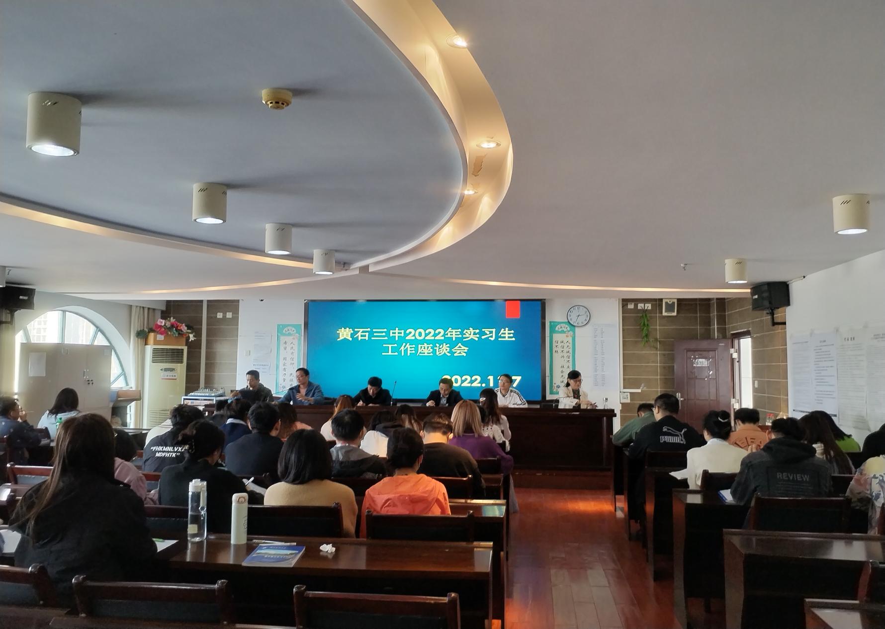 11月8日下午两点三十分,第一会所 英语系主任朱勇进、学工办主任黄志军前往黄石三中指导检查学生实习工作,并召开教育实习座谈会。黄石三中副校长赵虎、教务科研处副主任高雄风、英语教研组组长张红燕,全体2019级实习生参加了本次会议。会议由教务科研处主任罗威主持。