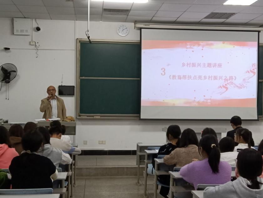 随后,郭在军老师为大家做了题为《教育帮扶点亮乡村振兴之路》的主题讲座。他结合在阳新县基层驻村帮扶五年的经历,从乡村的变化、教育帮扶、农村教育工作重点问题等三方面的问题展开论述。他提出要坚持落实“四个不摘”、发挥“湖师优势”、坚持“以点带面”的教育帮扶做法和建议。他强调师范生要深化国家乡村振兴战略的政策认知,强化师范生教学基本功,厚植乡土文化情结,浸润乡村教育情怀,增强服务乡村教育的本领和能力。讲座末尾,郭老师也对同学们关于乡村脱贫攻坚的问题进行了一一解答。