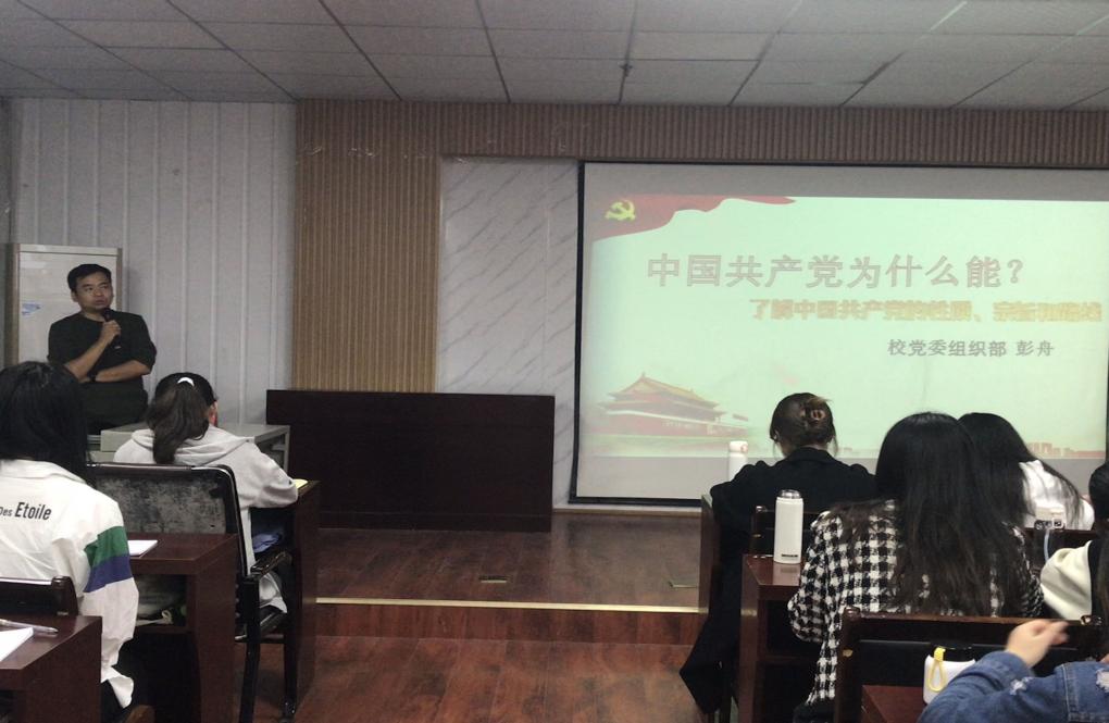 2022年11月6日下午6时30分,第一会所 第六十五期党校第二十三期入党培训班第二课在人文楼21B603教室顺利举行。本次党课主题为《中国共产党为什么能》,由校党委组织部副部长彭舟老师主讲。