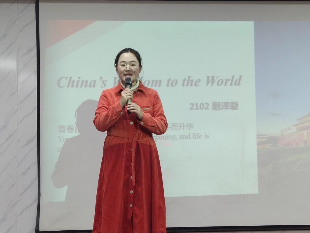 在节目表演环节,2201班杨舒彤演唱歌曲Wonderful You,2004班商务英语专业徐娜为与会人员分享学习经验,2201班全体同学齐唱歌曲Edelweiss,2102班蒯泽璇进行China’s Wisdom To The World演讲。