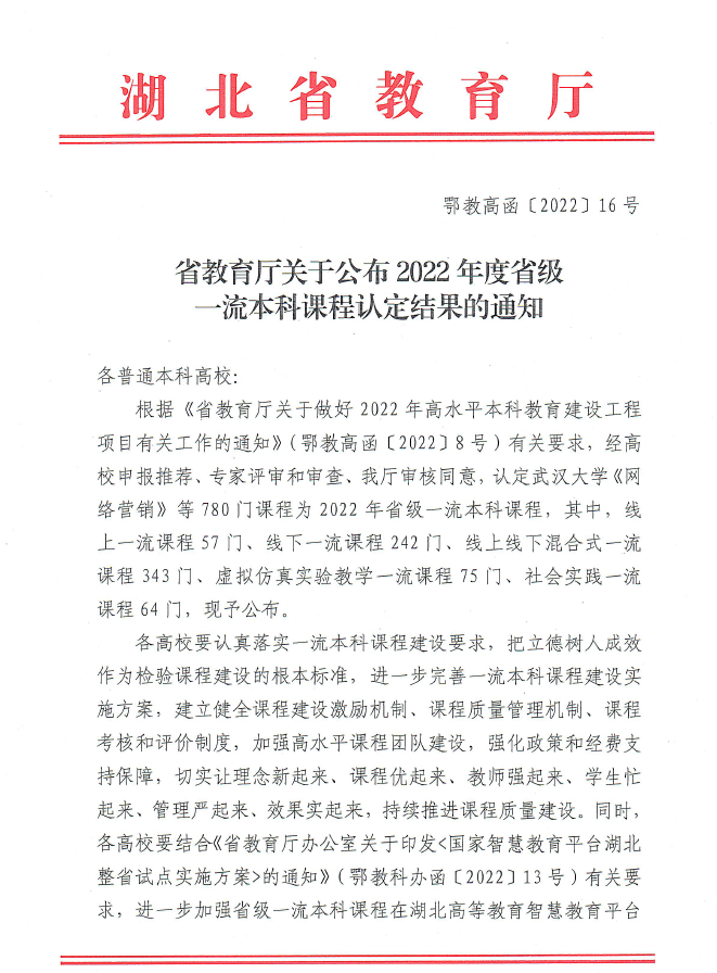 近日,湖北省教育厅发布了《省教育厅关于公布2022年度省级一流本科课程认定结果的通知》(鄂教高函〔2022〕16号)和《关于公布2022年湖北高校省级优秀基层教学组织名单的通知》(鄂教高函〔2022〕17号)文件。第一会所 唐凤华老师的课程《基础英语(二)》、王璐老师的课程《英语学科教学论》和伍文忠老师的课程《6小时解码英语新闻听力》获批为省级线上线下混合式一流课程。《英语专业核心课程组》获评2022年省级优秀基层教学组织。