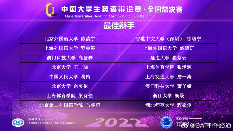 12月3-10日,2022年中国大学生英语辩论赛(CUDC)全国总决赛通过线上赛场举行。晋级本次总决赛的队伍来自北京大学、浙江大学、上海交通大学、复旦大学、北京外国语大学等高校。