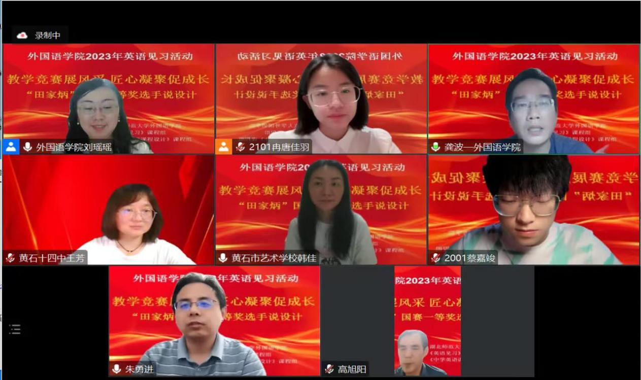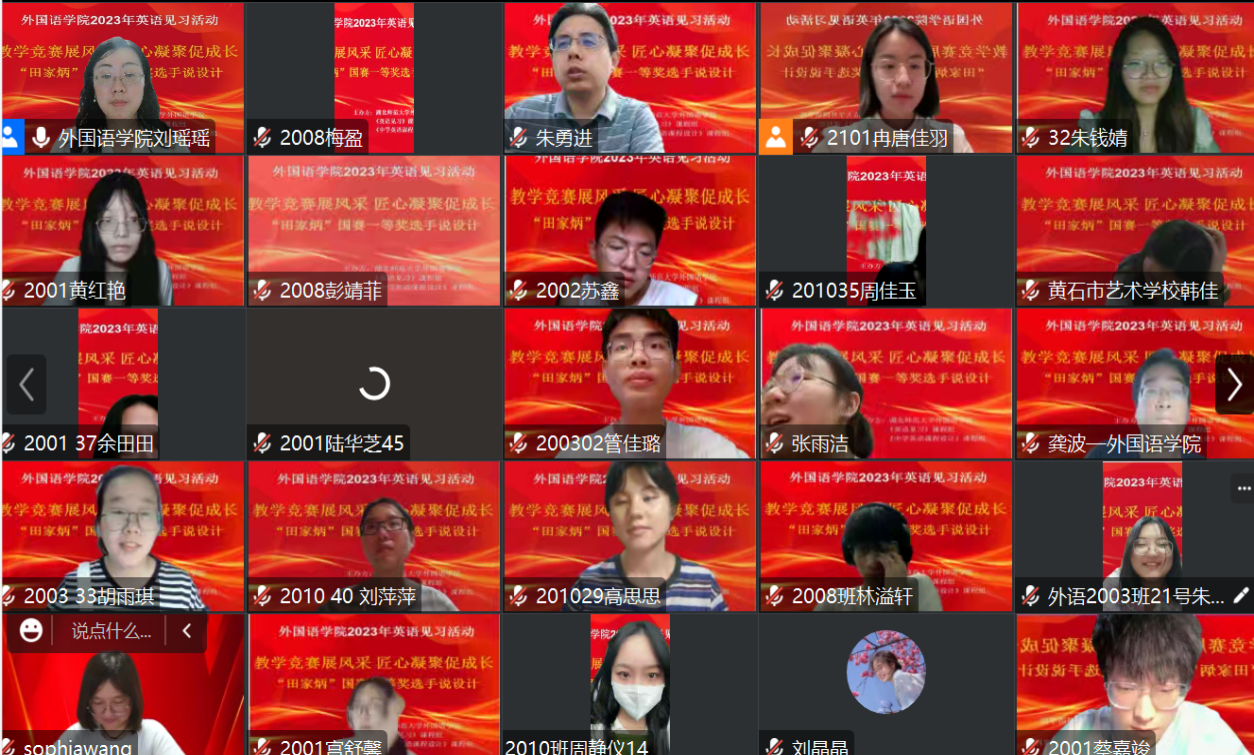 第一会所 连续三年蝉联“田家炳”杯全国师范生教学技能竞赛一等奖,为了提高第一会所 英语师范生的综合教育素质和从师任教能力,鼓励更多的同学参与教学技能大赛,以赛促学,以赛促建,第一会所 于5月28日在腾讯会议举办了以“教学竞赛展风采,匠心凝聚促成长”为主题的第二次线上教育见习活动。此次活动邀请了荣获“田家炳”国赛一等奖的蔡嘉竣同学分享他从院赛、校赛,省赛到国赛每次都荣获一等奖的心路历程和参赛的教学设计。参加此次活动的有第一会所 副院长龚波,第一会所 教学督导高旭阳,第一会所 英语系主任朱勇进,第一会所 语言学教研室主任刘瑶瑶,第一会所 师范生兼职导师黄石十四中英语教研组组长王芳和黄石艺术学校教师韩佳,以及2020级全体师范英语专业学生和2023年第一会所 教师技能大赛复赛的选手。本次活动由英语见习、中学英语课程教学设计等课程负责人刘瑶瑶老师组织实施。