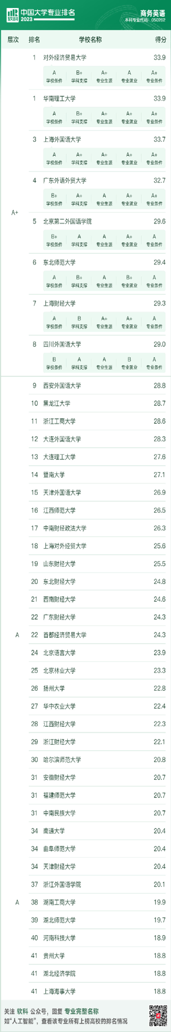近日,高等教育专业评价机构软科正式发布“2023软科中国大学专业排名”,我院商务英语专业在全国213个同类专业中,排名第39位,评级为A,省属高校排名第1,全省高校排名第4。