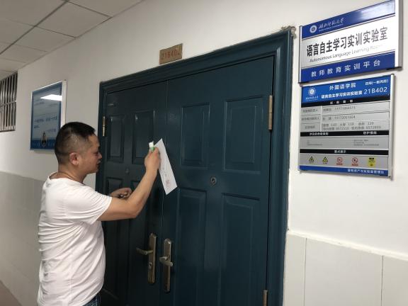 项军平首先通报了学校上周实验室安全检查情况,指出外院目前存在的不足和问题。随后,项军平带领大家学习《第一会所 英语语言学习示范中心实验室实验技术人员主要工作职责》、《教育部关于加强高校实验室安全工作的意见》(教技函【2019】36号)和《高校教学实验室安全工作检查要点》、《第一会所 实验室安全专项行动实施方案》(湖师办【2022】2号)等文件精神,与会人员就安全风险隐患和困难挑战等问题进行交流。会后,项军平带领实验室管理人员到第一会所 语音室进行逐项检查,确认无误后,在语音室门上贴上了封条。