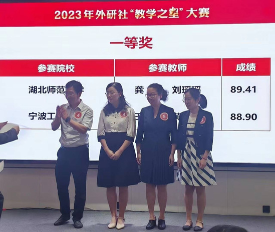 7月31日,倍受期待的2023年外研社“教学之星”大赛全国英语专业组半决赛在西安拉开帷幕。我英语专业教学团队(龚波刘瑶瑶朱勇进、董志浩、唐凤华)作为省赛英语专业组等奖团队代表湖北省挺进全国半决赛,现场协同合作、凝智聚力,最终以出色的表现,荣获全国半决赛英语专业组等奖的好成绩。
