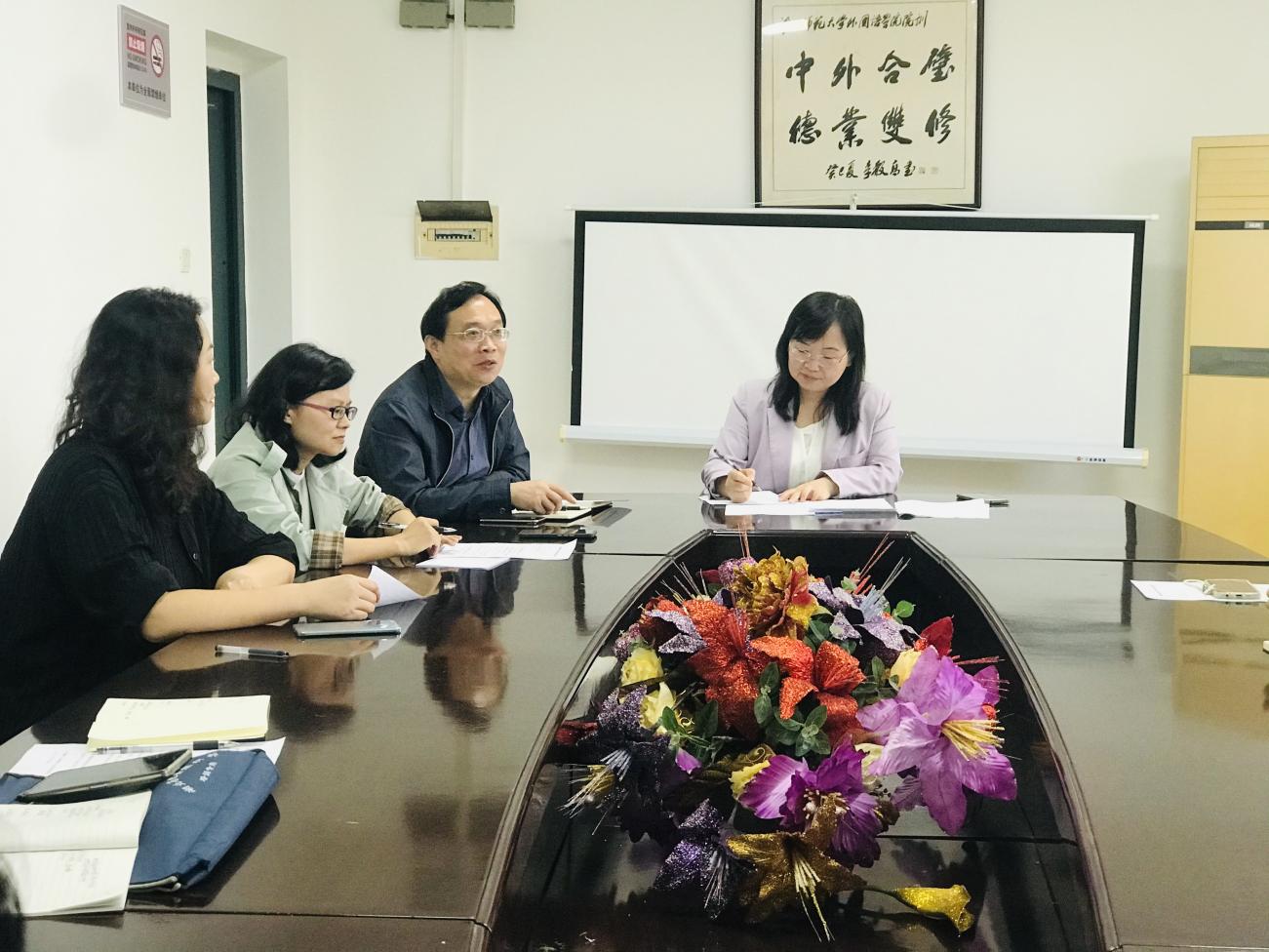 英语、商务英语、日语及法语专业负责人和担任“理解当代中国”课程的各位老师分享了“理解当代中国”系列教材的使用情况以及在课程教学目标设定、教学环节实施等阶段融入习近平新时代中国特色社会主义思想核心要义的典型做法。项军平强调,推进“三进”工作的关键是要扎实做好课程建设,培养学生跨文化思辨意识,提升学生讲好中国故事的能力。最后,刘敏对大家的发言进行了总结,并对第一会所 下一阶段“三进”工作进行了部署。