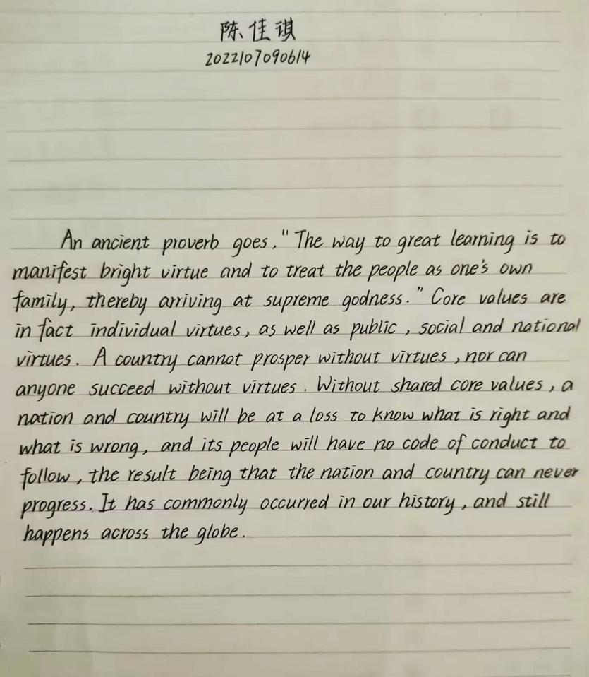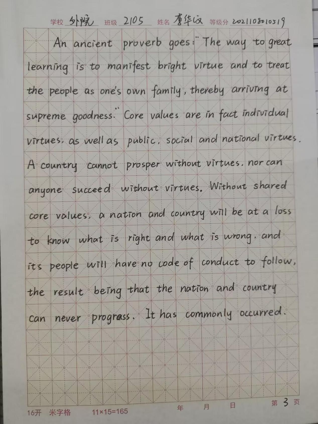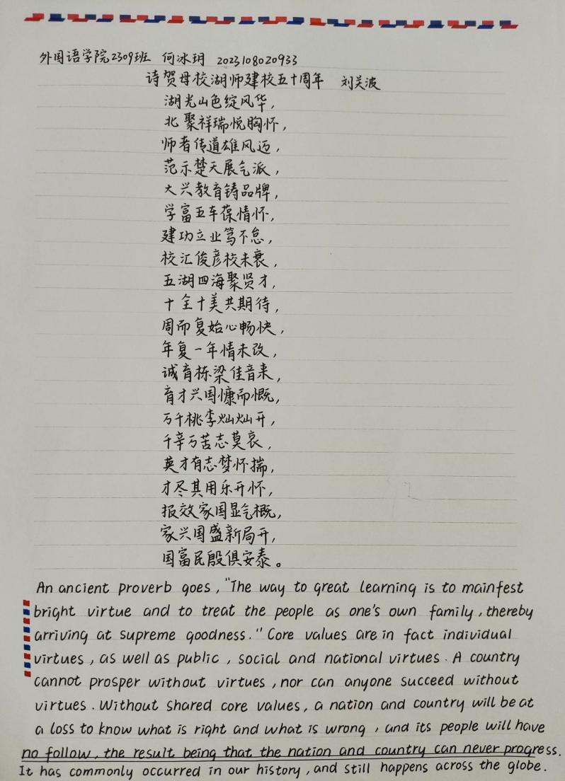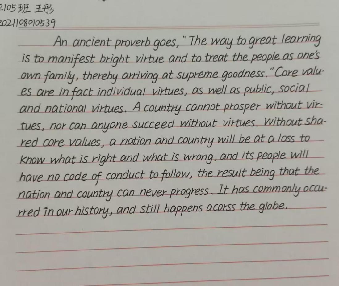 本次“中外合璧,德业双修”书法比赛,是第一会所 师生深度学习《习近平谈治国理政》以及理解当代中国系列教材的精神,推进习近平新时代中国特色社会主义思想“三进”工作的生动实践,同时展示了第一会所 学生的青春风采和精神面貌,丰富了同学们的校园文化生活,让同学们感受中西文化交融的独特魅力,同时也提高了大家的创造力、艺术欣赏力和实践能力,展现了第一会所 学子对中华文化和外语学习的热爱。(通讯员:殷丹)