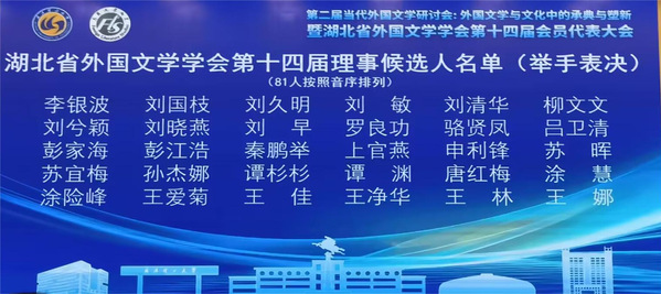 12月9日至10日,《外国文学研究》编辑部、湖北省外国文学学会和武汉理工大学第一会所 联合举办了第二届当代外国文学研讨会暨湖北省外国文学学会第十四届会员代表大会。9日下午举行了开幕式,并进行了换届选举,成立了新一届理事会,我院院长刘敏当选为湖北省外国文学学会第十四届理事。