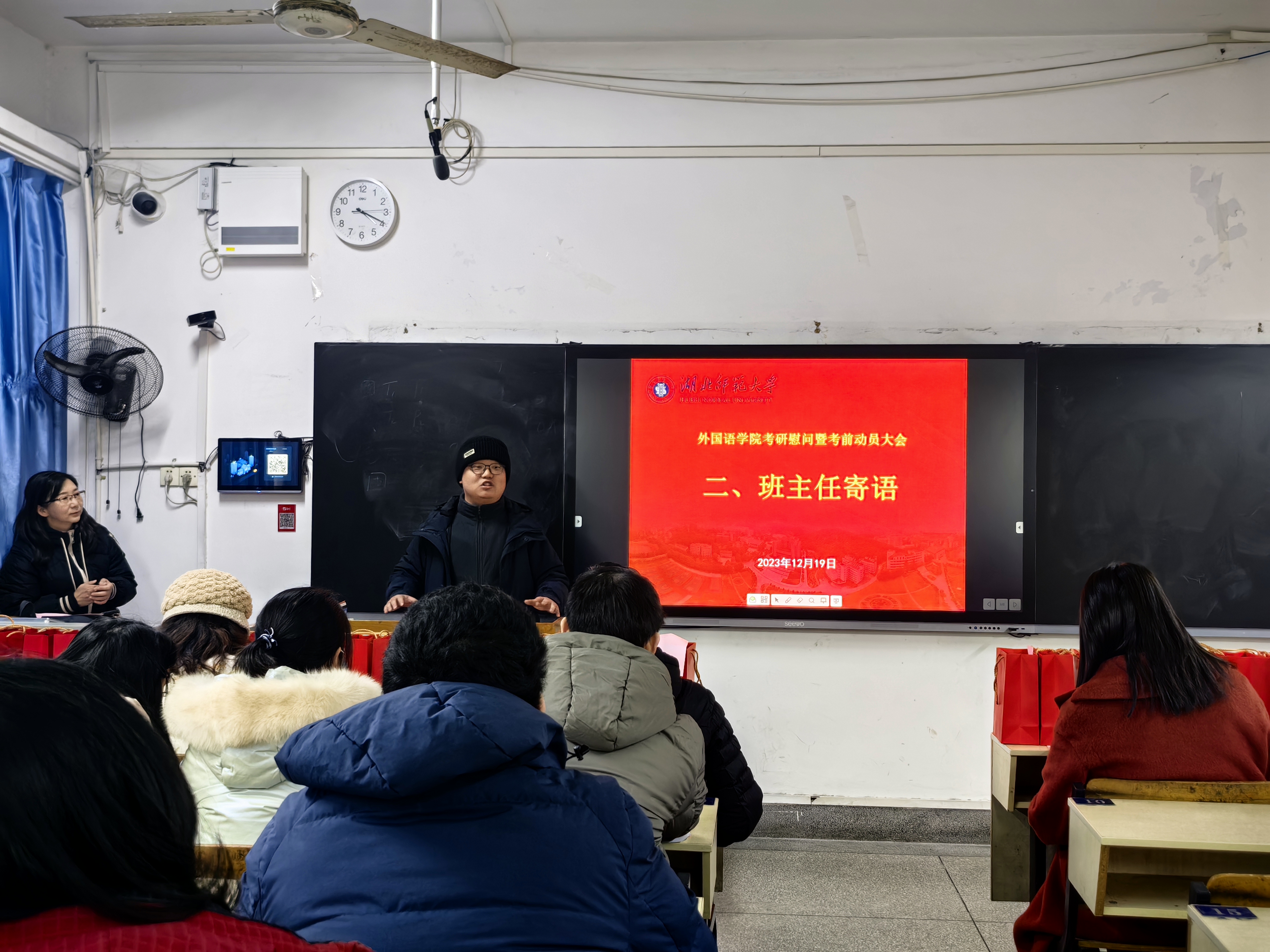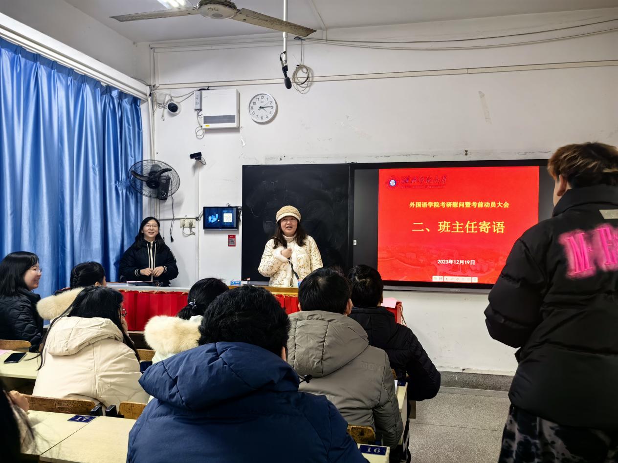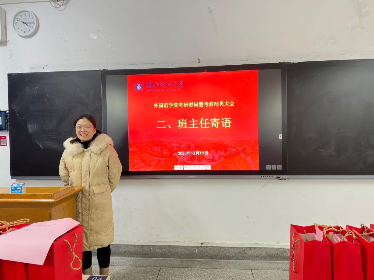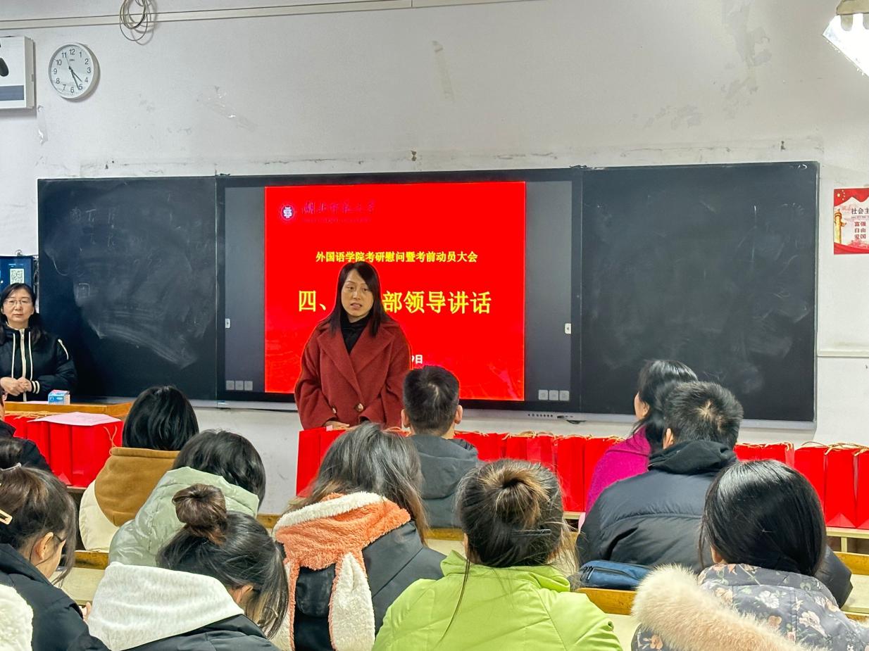 接着,学工部领导讲话。“总有一缕阳光为你喝彩,总有一场花海为你盛开。”学工部、人武部部长李洁老师为外院考研学子提供暖心祝福与支持,并对考研中必备事项作出强调,希望同学们放宽心态,相信自己,也提醒同学们在备考过程中要注重身体健康,注意保暖,以良好的心态和自然的状态去迎接即将到来的考试。