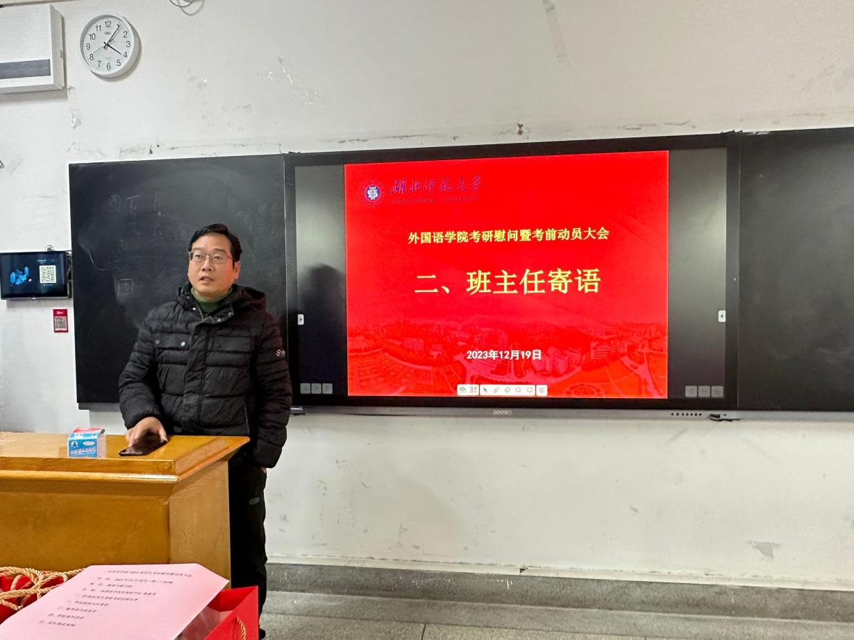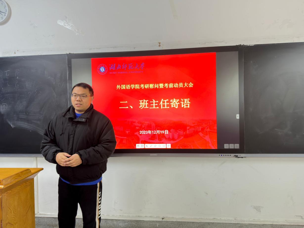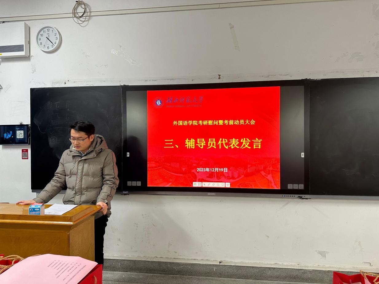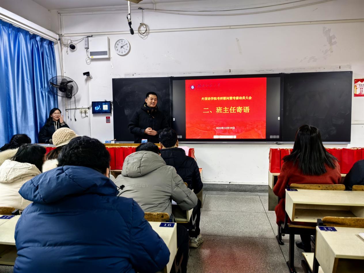 接着,学工部领导讲话。“总有一缕阳光为你喝彩,总有一场花海为你盛开。”学工部、人武部部长李洁老师为外院考研学子提供暖心祝福与支持,并对考研中必备事项作出强调,希望同学们放宽心态,相信自己,也提醒同学们在备考过程中要注重身体健康,注意保暖,以良好的心态和自然的状态去迎接即将到来的考试。
