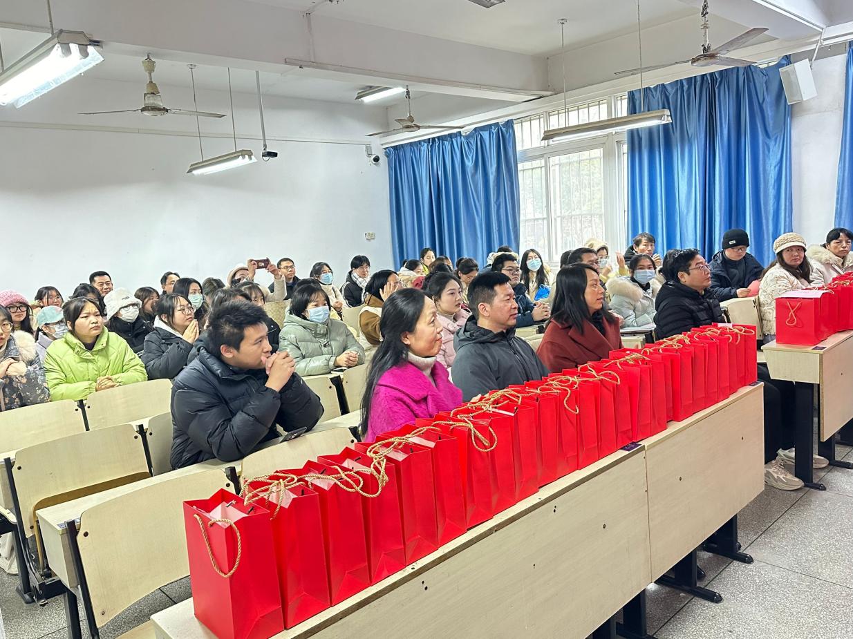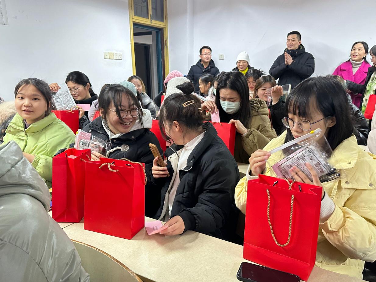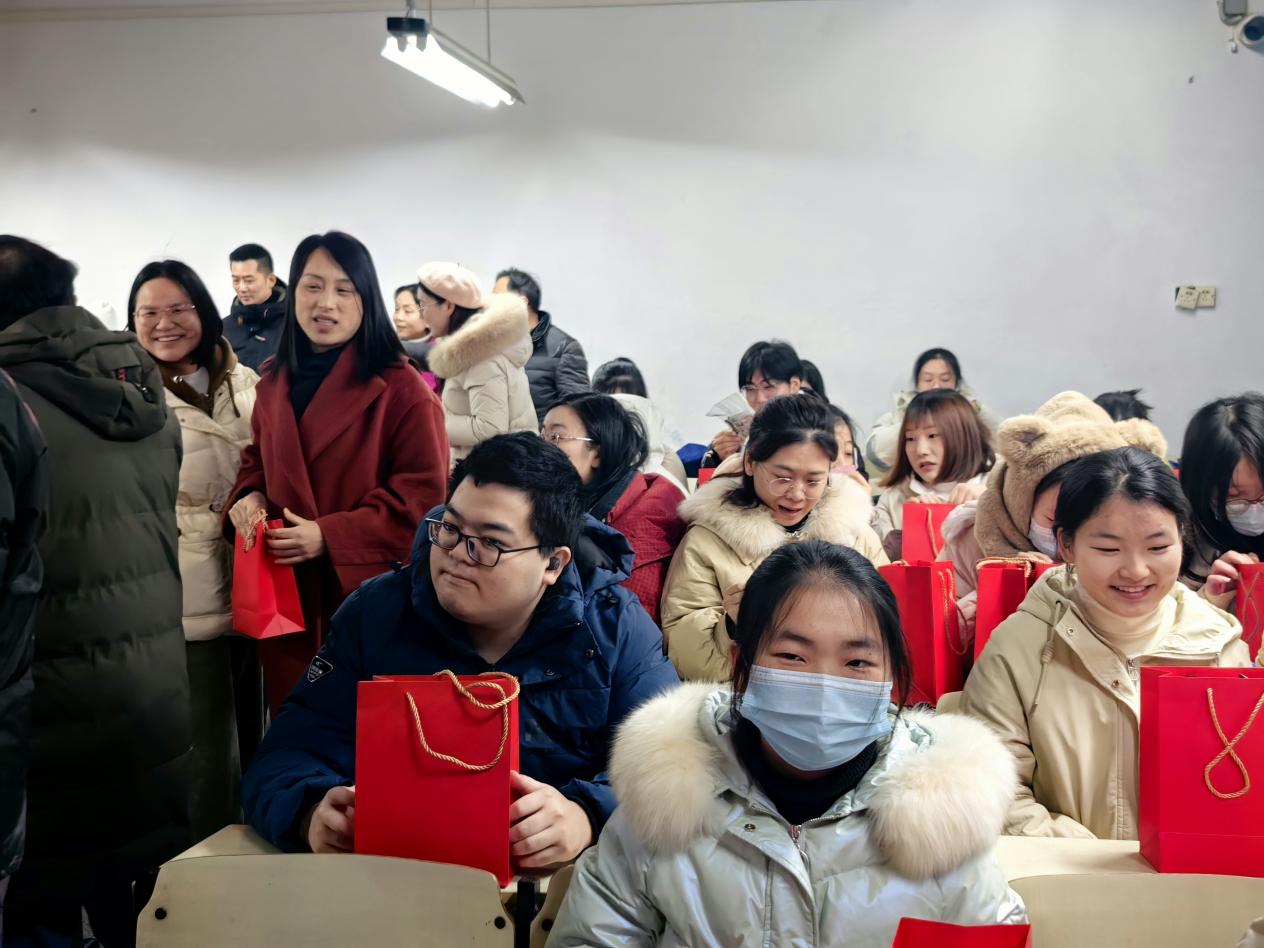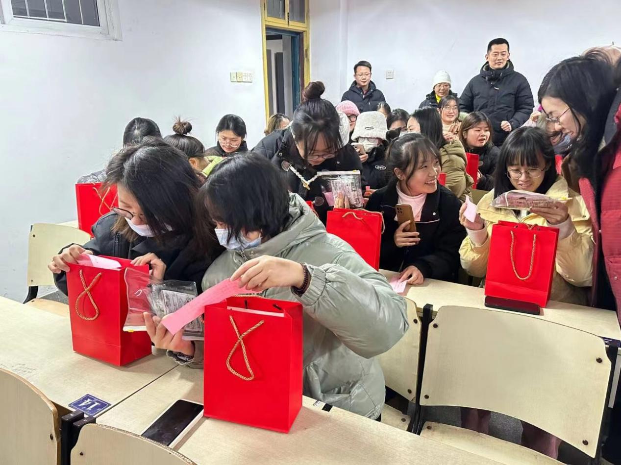 随后,为了鼓励考研学子,与会领导老师为同学们发放了精心准备的爱心礼物,饱含了对学子的祝福与期盼,里面有苹果、橙子、暖宝贴、文具笔袋等物品,愿同学们“苹苹”安安,马到“橙”功,心意满满,也让考研学子在紧张的备考中心里暖暖。