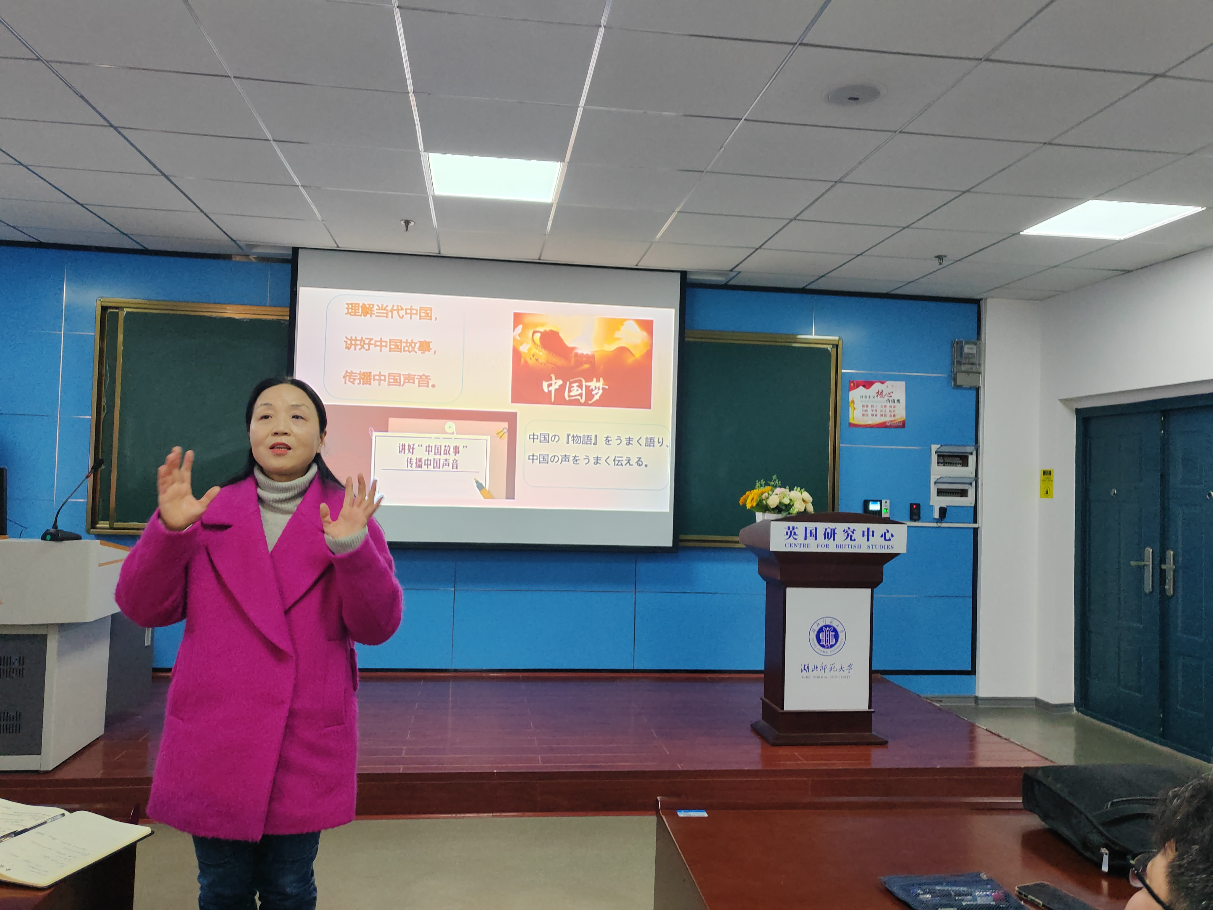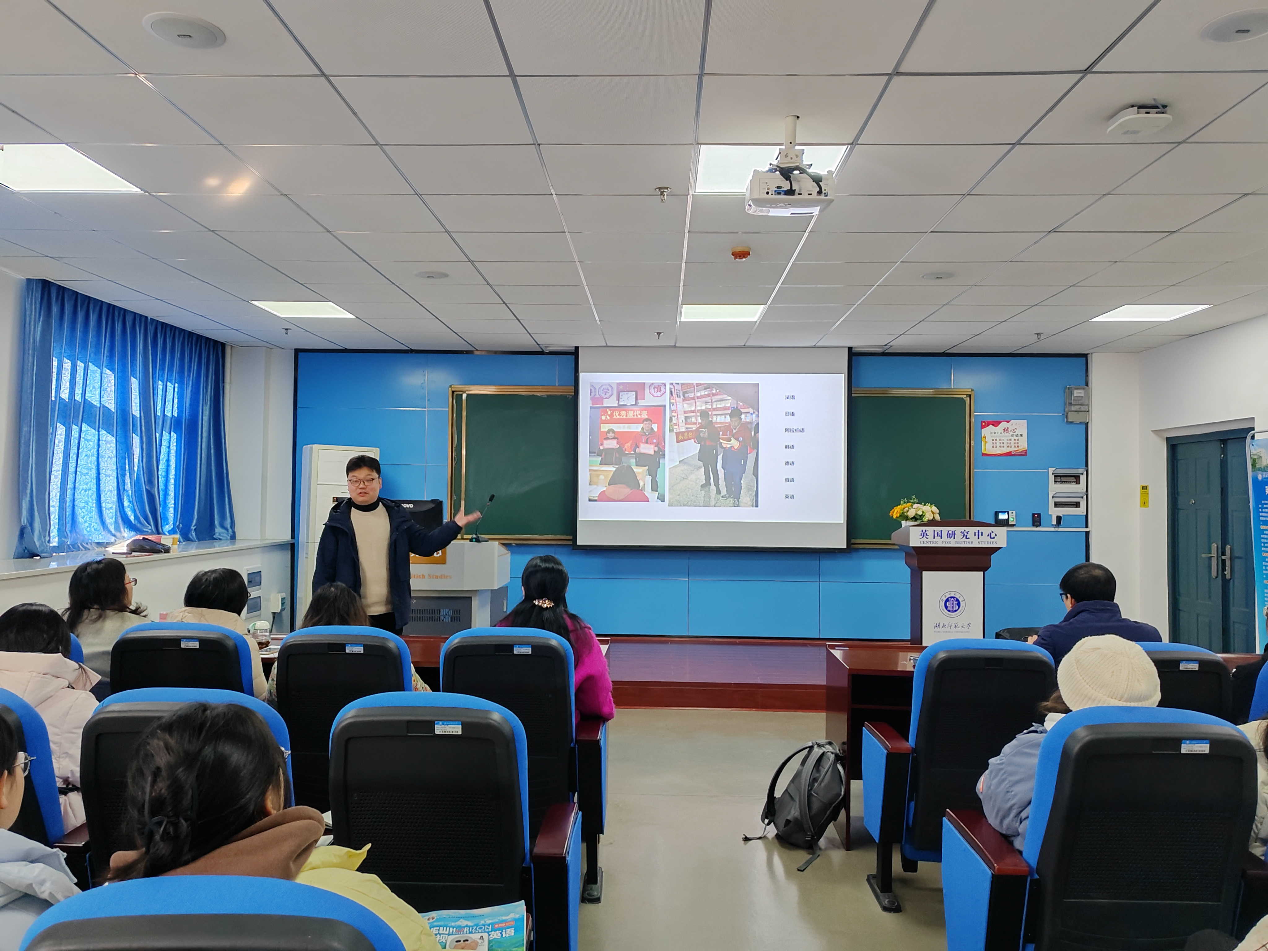 之后,作为教师代表,日语系教师颜龙龙博士以《冲出封闭空间——浅谈我的日语学习之路》为题,现身说法,结合自己的日语学习之路进行了学习经验介绍,并分享了自己在日本留学的经历和见闻,为同学们坚定了学好日语的决心,也拓展了更为广阔的语言学习视野。