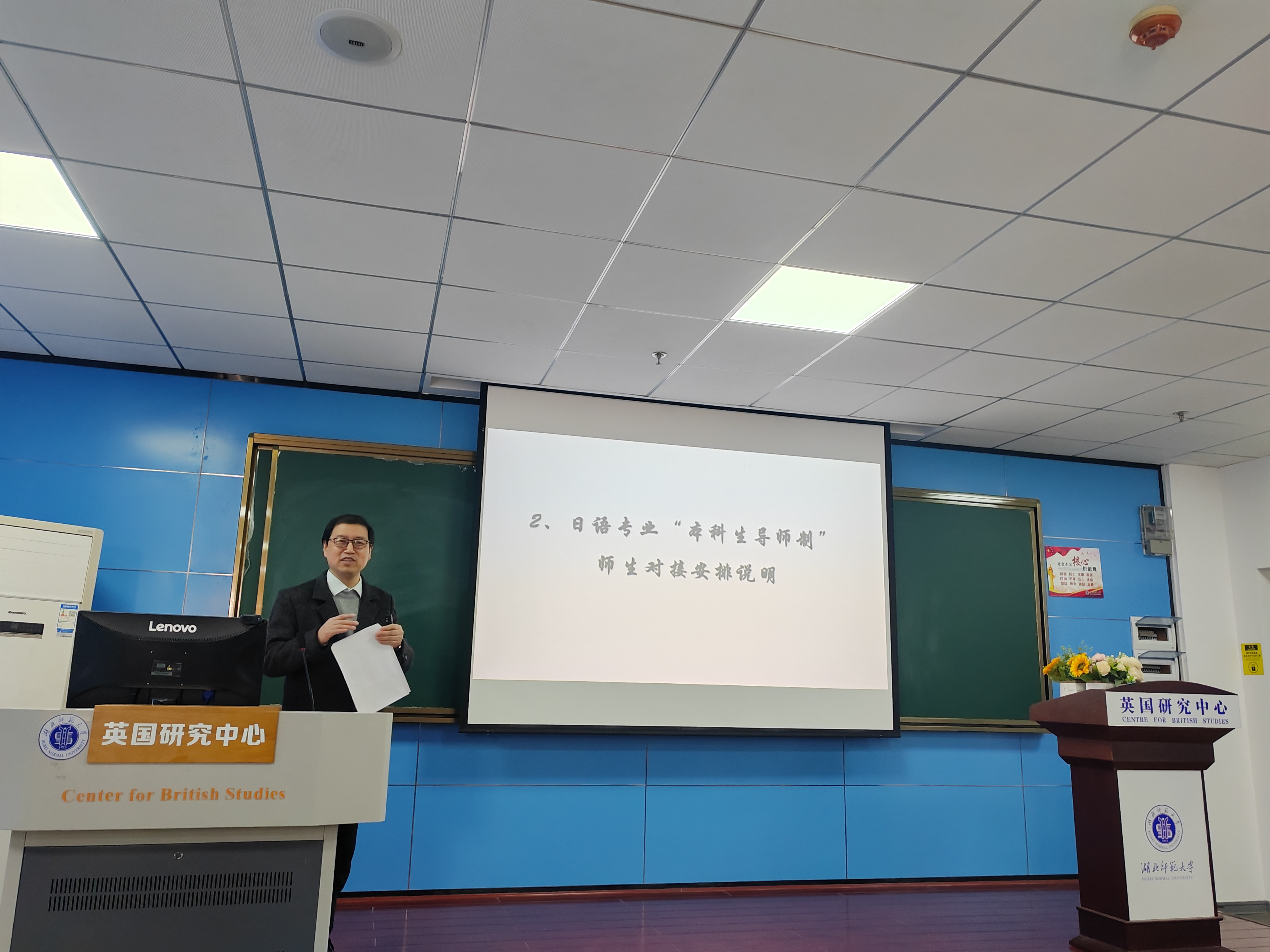 随后,杨钢老师对日语专业新实施的“本科生学业导师制”进行说明,他强调了导师的职责,并请9名日语教师与42名学生进行了逐一对接。期待本科生导师制的实施能够进一步提高日语系人才培养质量。