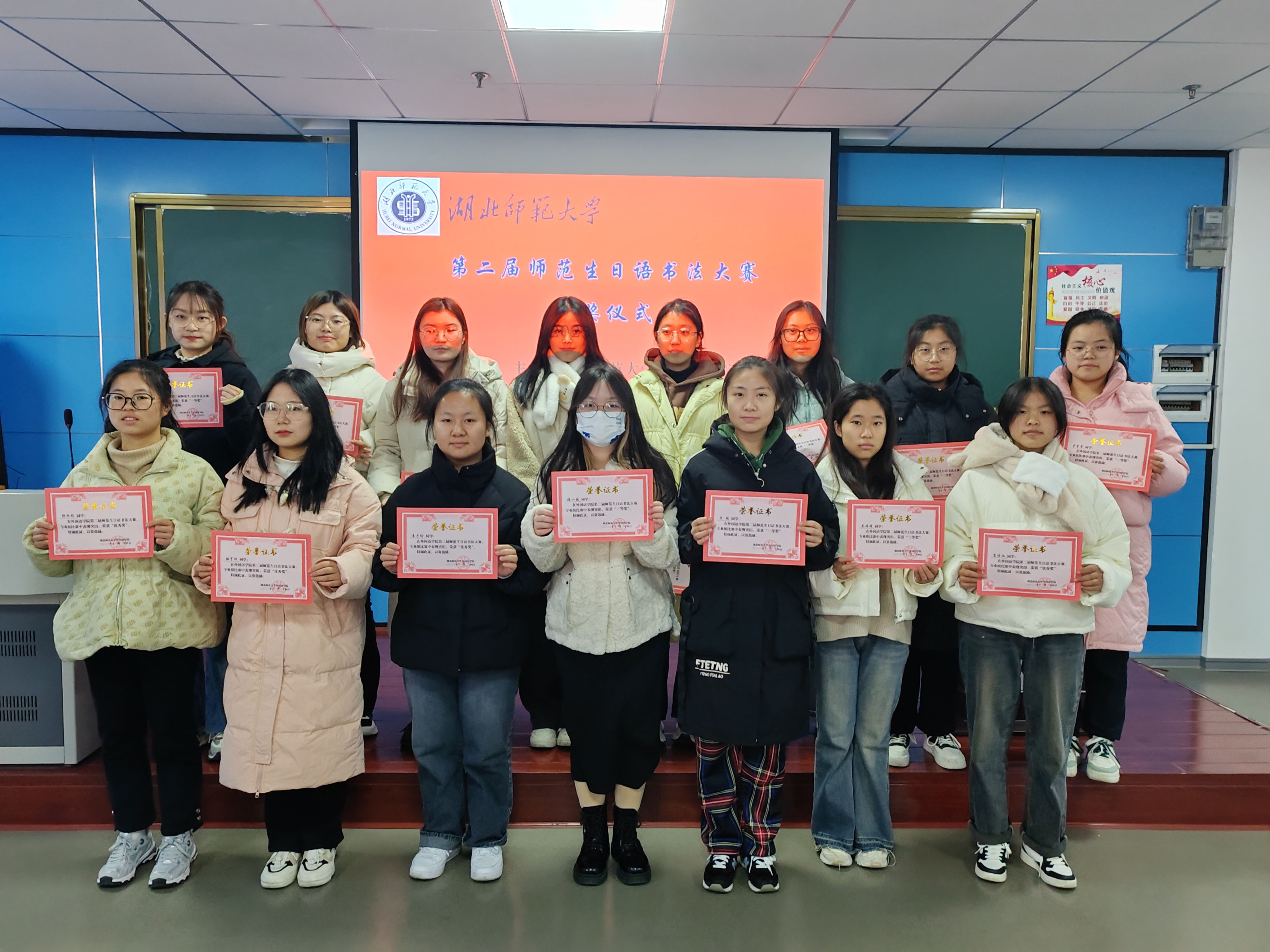 本次班会由多个环节组成。首先,会议举行了第二届师范生日语书法大赛颁奖仪式,老师们为在比赛中获奖的同学颁发了获奖证书。