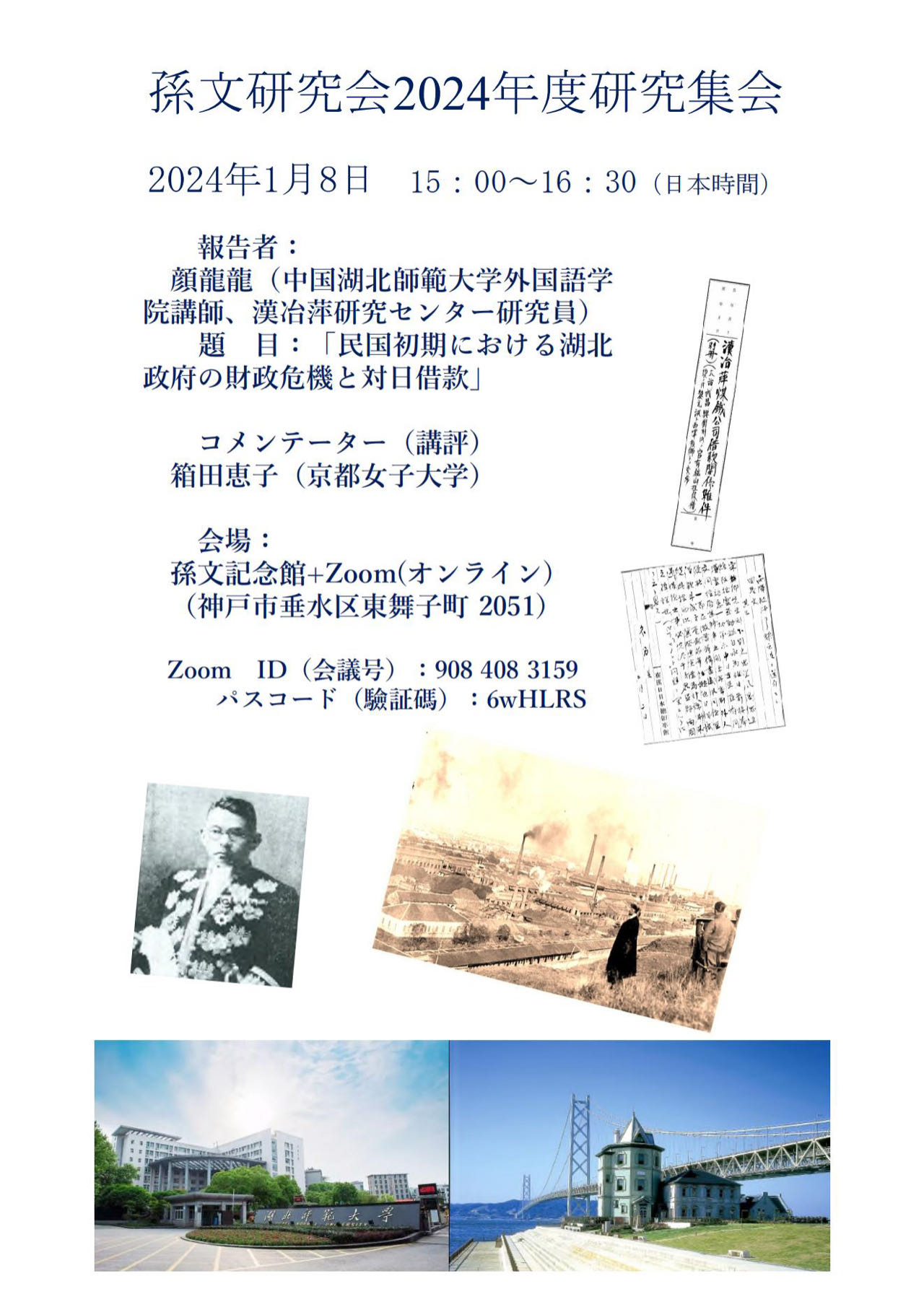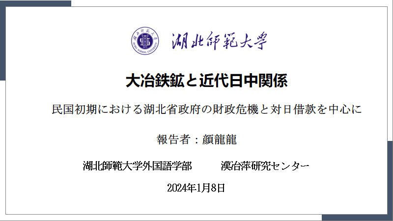 1月8日,我院日语系教师颜龙龙应日本孙文纪念馆和孙文研究会邀请,为日本孙文研究会的全体会员作『大冶铁矿と近代日中関係−民國初期における湖北政府の財政危機と対日借款を中心に−』(“大冶铁矿与近代中日关系——以民国初年湖北政府的财政危机与对日借款为中心”)的学术报告,此次报告会由日本神户大学文学部教授绪形康主持,日本京都女子大学文学部教授箱田惠子担任特约评论员。