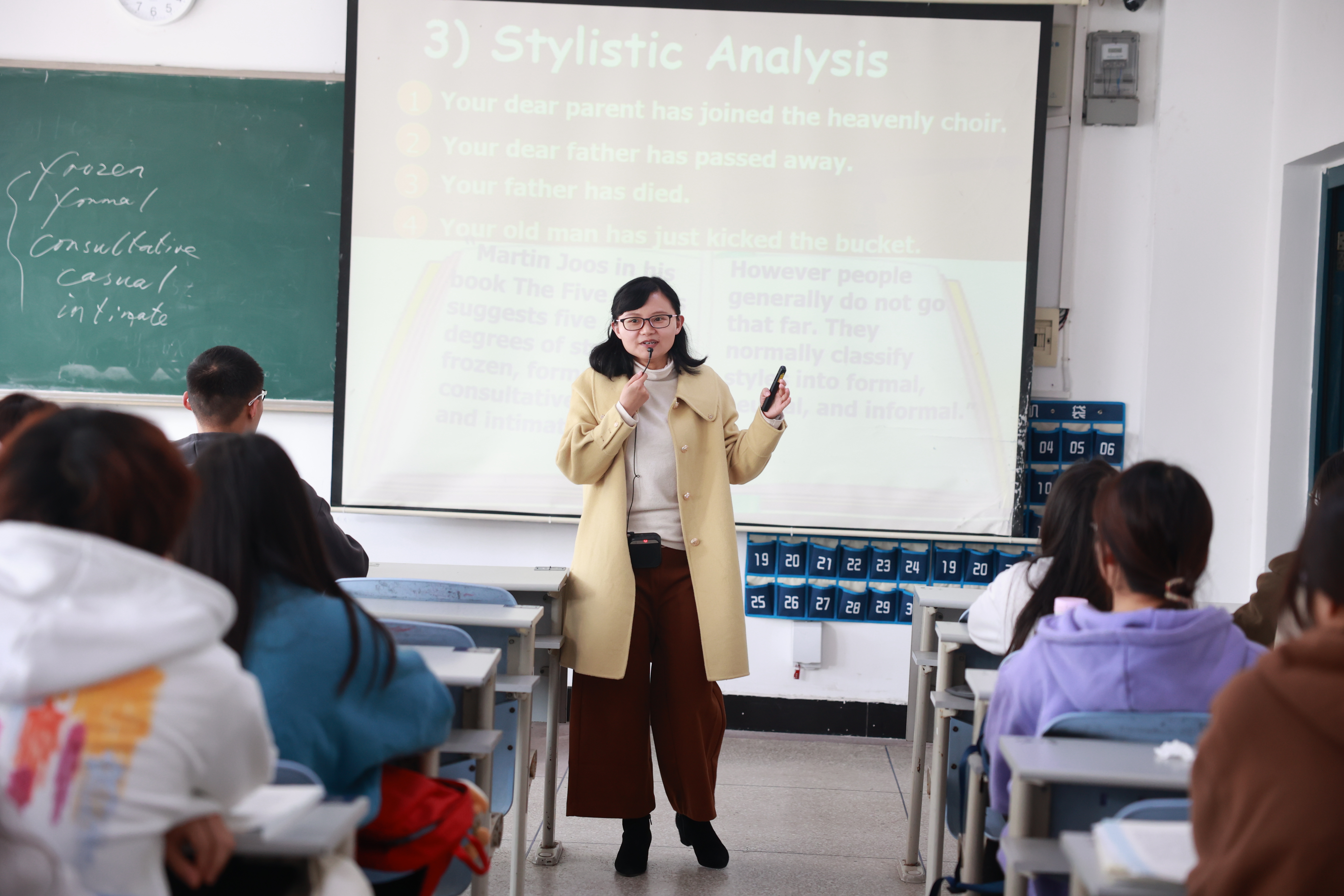 4月2日上午,南潮教授在21B508教室讲授英语词汇学课程,语言学教研室所有教师观摩了本次授课。