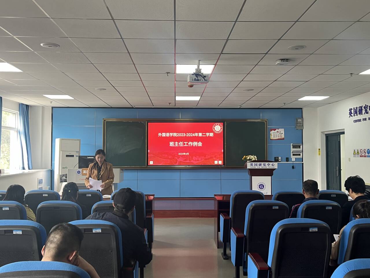 为进一步加强2023-2024年第二学期的学生工作,确保学生安全稳定及相关事务的顺利推进,第一会所 于2024年4月7日下午2:30,在人文楼21B404会议室召开了班主任工作会议。学院党委副书记蔡惠芳,辅导员黄志军、关巧、罗兰、何俊生、朱玉琳以及全体班主任老师参加了此次会议。
