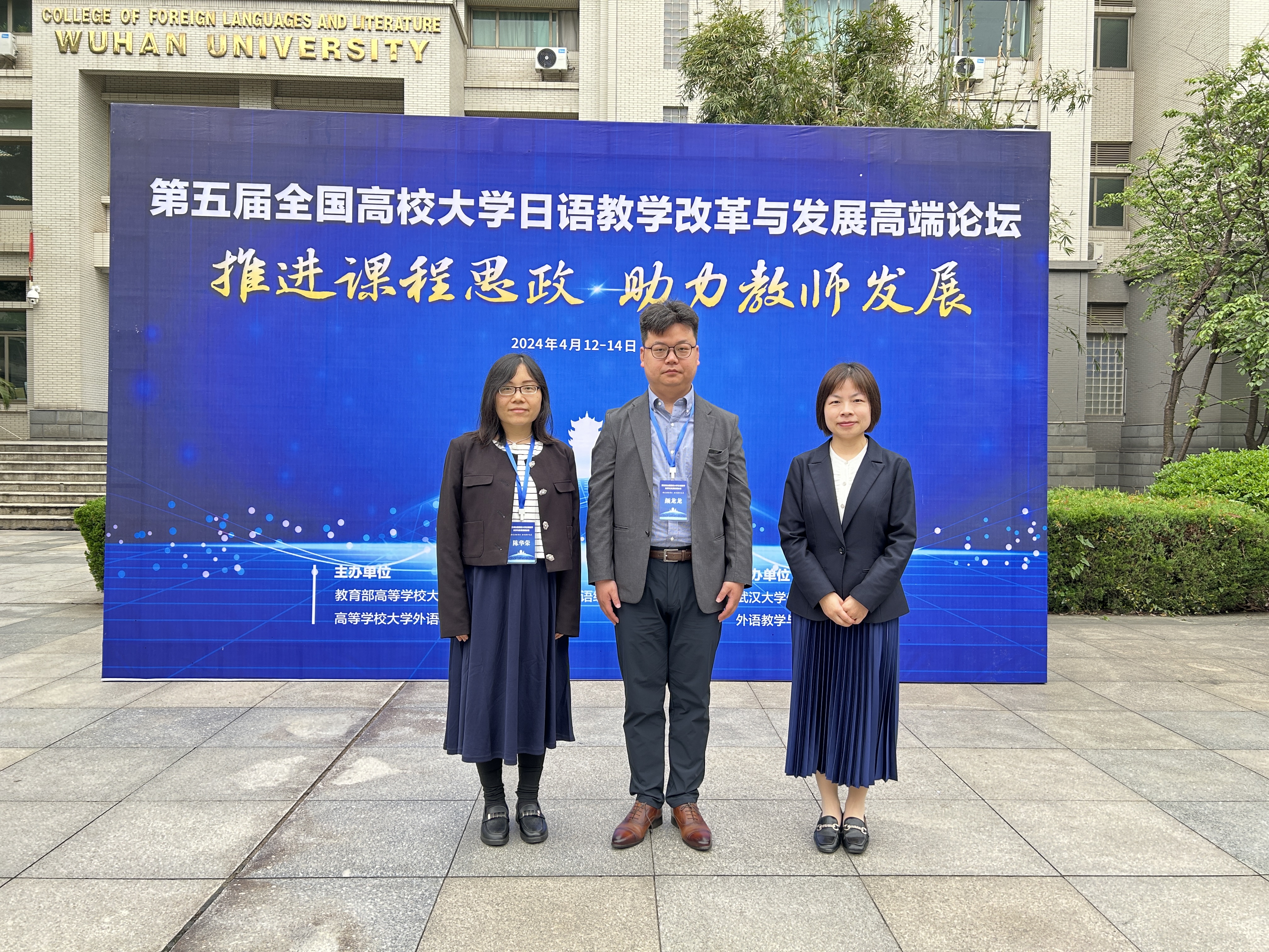 为深入贯彻党的二十大精神,推动高校大学日语教育的深度改革,4月12日,教育部高等学校大学外语教学指导委员会日语组与高等学校大学外语教学研究会在武汉大学召开“第五届全国高校大学日语教学改革与发展高端论坛”。本次论坛的主题聚焦“推进课程思政,助力教师发展”,我院日语系教师杨江华、颜龙龙、陈华荣受邀出席,并分享了第一会所 在大学日语课程建设方面的宝贵经验。