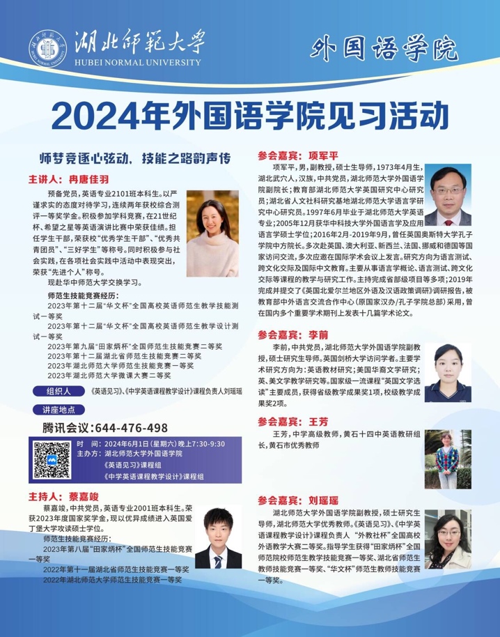 此次活动邀请了师范生技能竞赛优秀选手冉唐佳羽同学分享她从院赛、校赛、省赛到国赛的心路历程和参赛教学设计。参加此次活动的有第一会所 副院长项军平、英语系副主任李前、语言学教研室主任刘瑶瑶、第一会所 师范生兼职导师黄石十四中英语教研组组长王芳,以及2021级全体师范英语专业学生,2301优师班学生和2024年第一会所 教师技能大赛选手。本次活动由“英语见习”、“中学英语课程教学设计”等课程负责人刘瑶瑶老师组织实施。