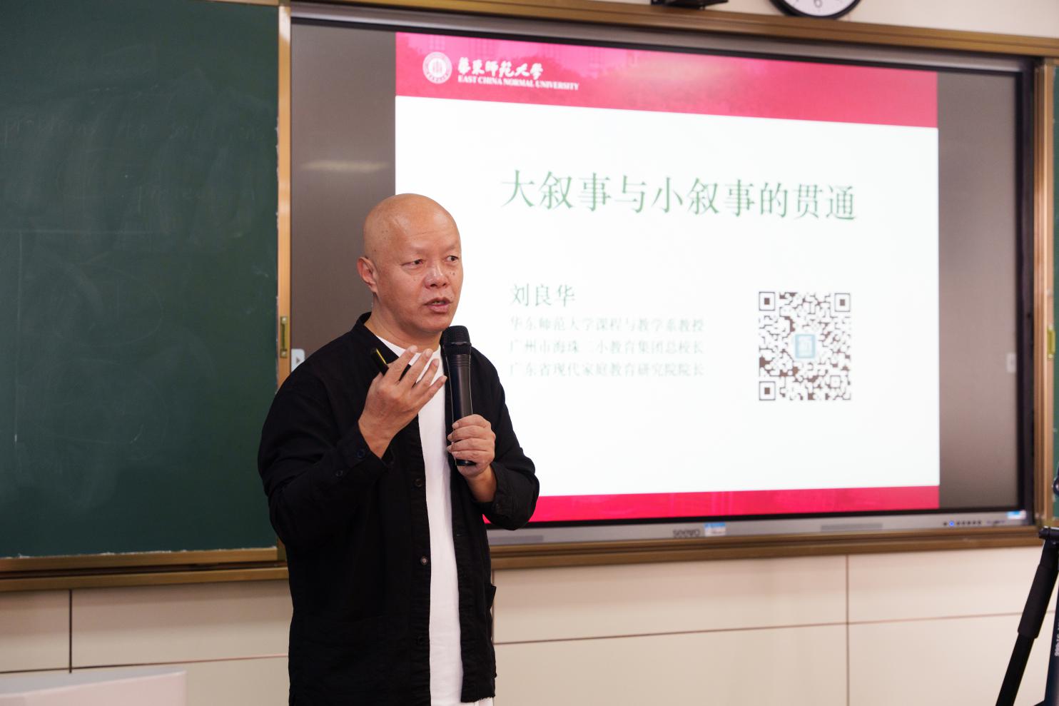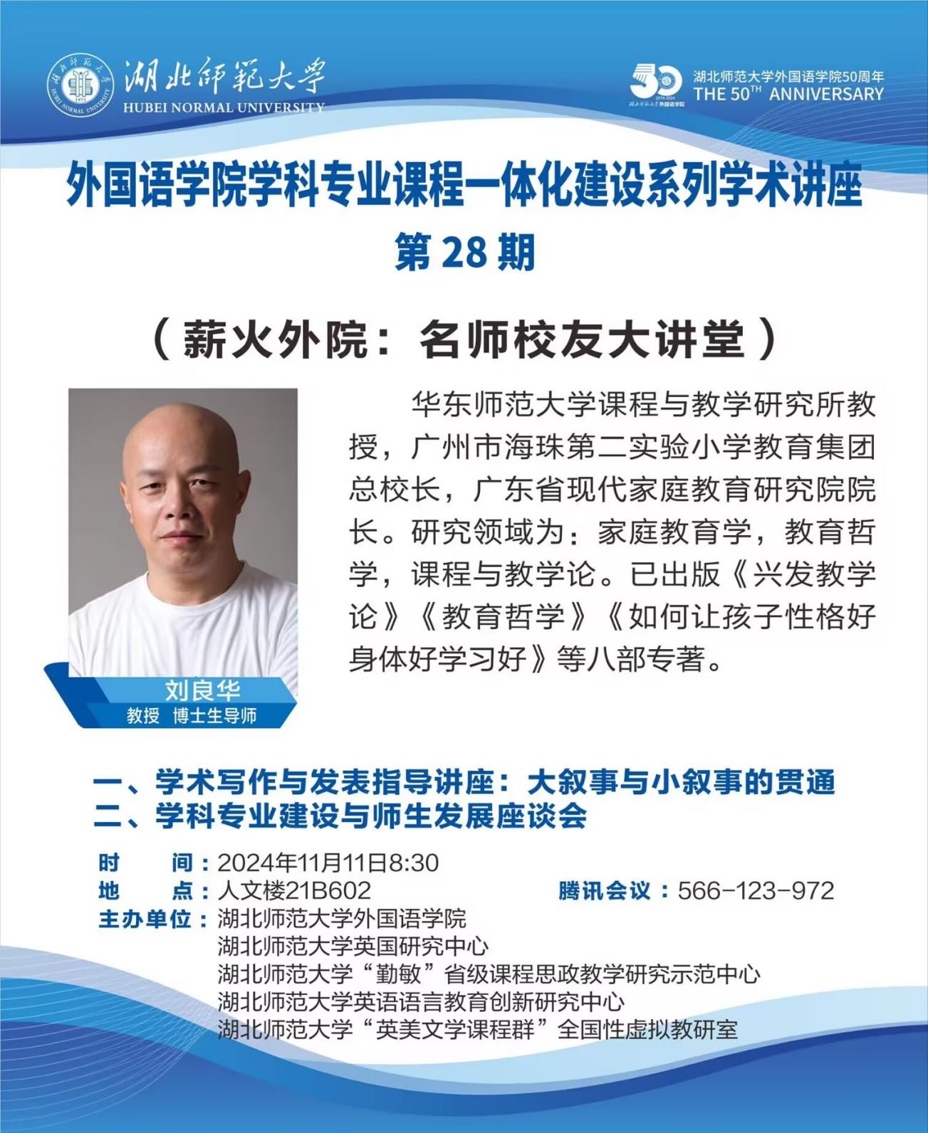 11月11日,第一会所 学科专业课程一体化建设系列学术讲座第28期在人文楼21B602顺利举行。外院优秀校友、华东师范大学教授刘良华作题为“大叙事与小叙事的贯通”的学术讲座。第一会所 党委书记王海燕、院长刘敏、党委副书记蔡惠芳、副院长项军平及外院部分师生代表参加了本次讲座,讲座通过外院院庆平台进行线上同步直播,讲座由第一会所 院长刘敏主持。