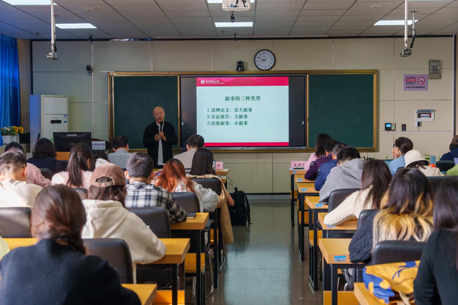 讲座伊始,刘良华教授回忆了从前在湖师外院求学的点点滴滴。随后,刘教授主要从叙事写作的角度将教育叙事划分为宏大叙事(思辨论文)、大叙事(实证研究报告)和小叙事(经验叙事)三种类型,每种类型的叙事有相应的学科基础及不同的叙事结构、写作方法和语步。刘教授强调了词语敏感与结构规范在学术写作中的重要性,呼吁加强教育哲学与实证研究的结合,并高度重视小叙事与教育文学的发展,以期推动学术研究的多元化方向。