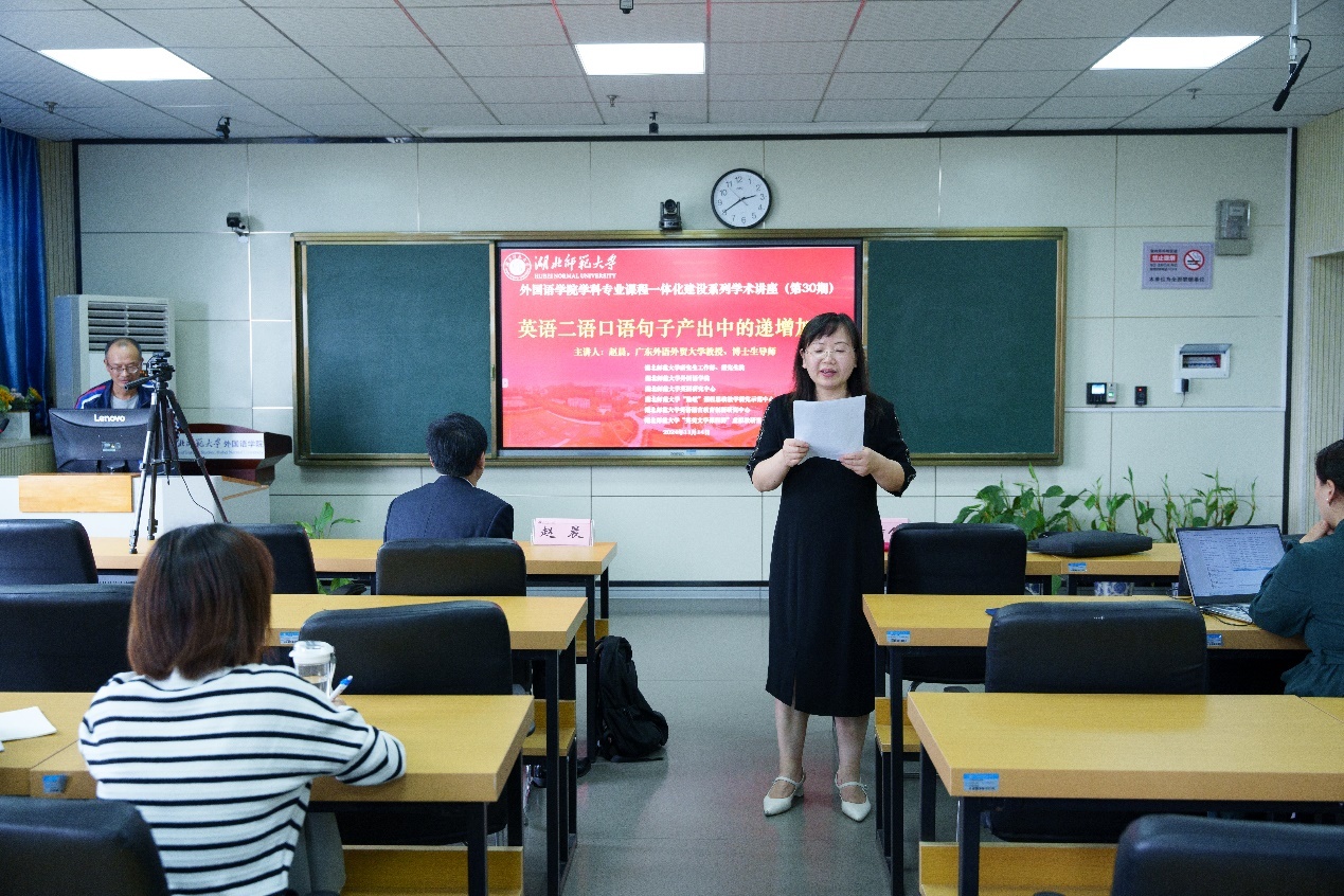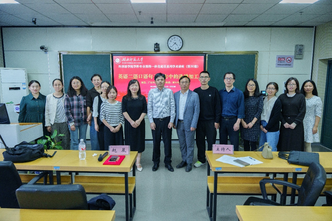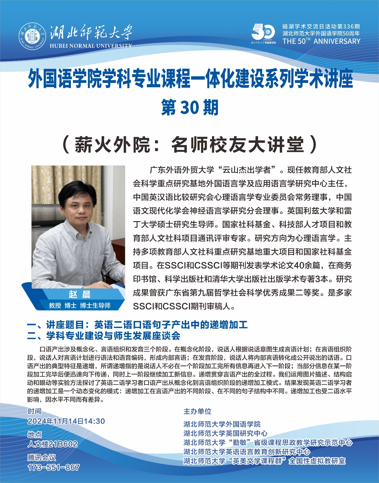 11月14日下午,第一会所 学科专业课程一体化建设系列学术讲座第30期在人文楼21B602顺利举行。广东外语外贸大学“云山杰出学者”、博士生导师赵晨教授作题为“英语二语口语句子产出中的递增加工”。我院全体专任教师以及硕士研究生代表参与讲座,本次讲座通过腾讯会议线上同步直播。讲座由第一会所 院长刘敏主持。