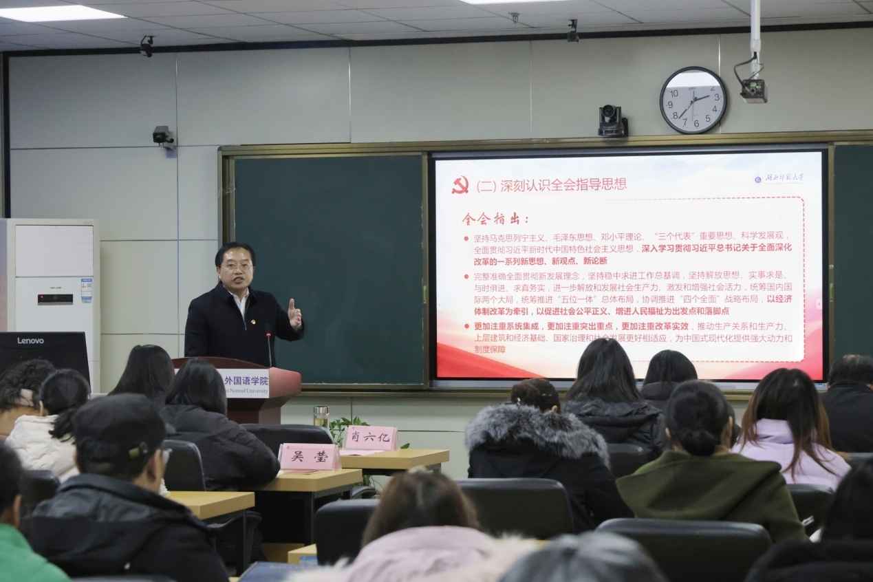 在专题党课中,肖六亿以《深学细悟党的二十届三中全会和习近平总书记系列重要讲话精神,笃行实干抓好贯彻落实》为题,从深入学习领会习近平总书记重要讲话精神和全会精神、深刻把握全会关于深化教育综合改革的重大部署、深刻领会习近平总书记考察湖北重要讲话精神、全力以赴抓好全会精神贯彻落实四个方面进行了深入分析解读。肖六亿强调,全体党员要在工作中争先锋、做表率,深入学习贯彻党的二十届三中全会和全国教育大会精神,认真学习领会习近平总书记考察湖北重要讲话精神,坚决贯彻落实党中央关于教育科技人才一体推进的战略部署,以钉钉子精神抓好学校各项改革任务落地见效,为推进中国式现代化建设湖师实践做出新的更大贡献。