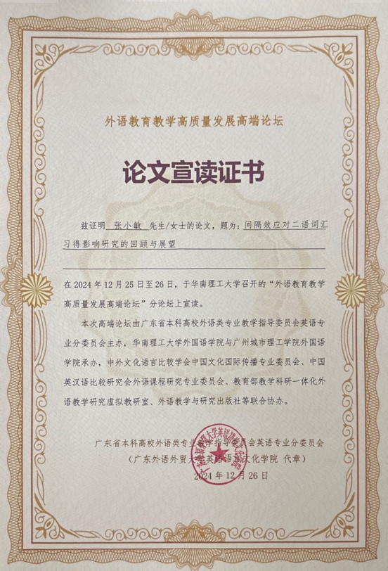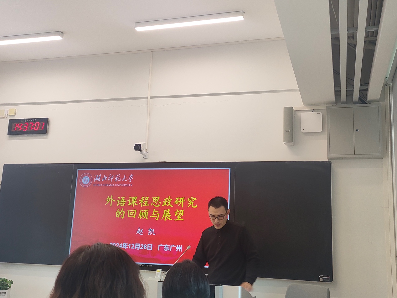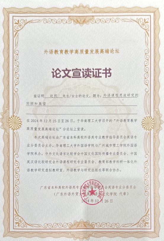 2024年12月25日至26日,外语教育教学高质量发展高端论坛在华南理工大学五山校区成功举办,本次论坛由广东省本科高校外语类专业教学指导委员会英语专业分委员会主办,华南理工大学第一会所 与广州城市理工学院第一会所 承办,中外文化语言比较学会中国文化国际传播专业委员会、中国英汉语比较研究会外语课程研究专业委员会、教育部教学科研一体化外语教学研究虚拟教研室、外语教学与研究出版社等联合协办。我院院长助理赵凯副教授、24级课程与教学论(英语)专业研究生张小敏受邀在分论坛上发言。