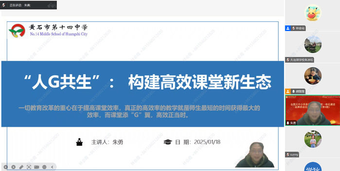 另一位讲座嘉宾黄石市第十四中学的朱勇校长进行了以“‘人机共生’:构建高效课堂新生态”为题的讲座。朱勇校长在信息技术与教育融合方面有着深入的研究和丰富的实践经验。他指出“人机共生”理念对于当今构建高效课堂新生态的重要意义,并分享了评价该理念下高效课堂的三个标准,即提升人机交互的认知主动性和深度,平衡“课前预设”与“动态生成”的配比,以及强化生成内容的真伪鉴别和安全。朱老师还从信息量、训练量和思维量三个“量”,以及形动、心动和神动三个“动”的角度对“人机共生”下的高效课堂进行阐释。随后,朱老师从理论透视、功能阐释和场景应用三个方面详细介绍如何构建“人机共生”下的高效课堂,分享了如何将信息技术有效融入教学的实用策略,推动实现人机协同教学,提升教学质量和效率。