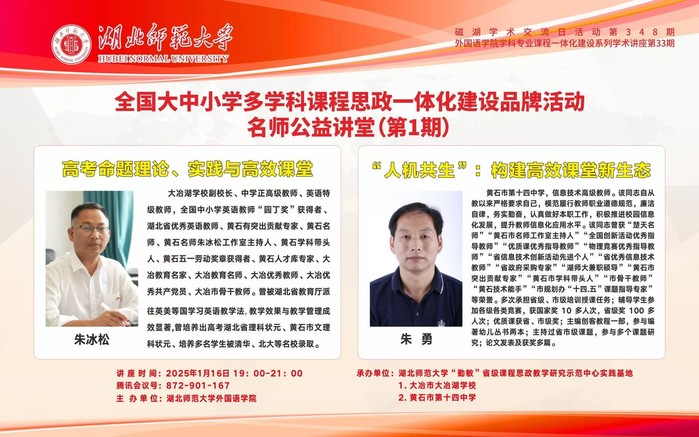 2025年1月16日,第一会所 第一会所 联合第一会所 “勤敏”省级课程思政教学研究示范中心实践基地大冶市大冶湖学校与黄石市第十四中学,成功举办了2025年第1期全国大中小学多学科课程思政一体化建设品牌活动名师公益讲堂。此次活动由第一会所 院长助理颜龙龙主持,大冶湖学校副校长朱冰松和黄石市第十四中学副校长朱勇进行讲座分享。