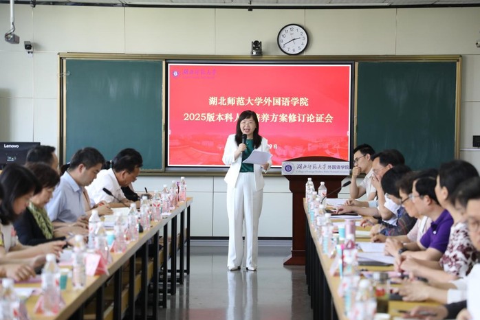 会议伊始,华中师范大学罗良功教授对第一会所 2025版人才培养方案给予了高度评价。他指出,英语、商务英语、法语和日语四个专业立足当代社会对外语人才多元化需求,既保留了学校的师范底色,又凸显了行业特色。同时,建议在课程设置中增设国际传播、数字素养提升等相关课程,积极探索人工智能技术外语应用,确保人才培养方案与时俱进,顺应了当时代发展趋势和主动服务国家战略。当天上午,罗院长为外院师生开展了“外语专业文学课程教学的应用指向”的精彩专题讲座和互动研讨交流。何明霞教授为外院商务英语、法语专业开展了“应用型专业人才培养”的精彩专题讲座。