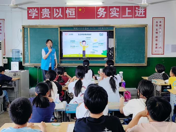 在排市初级中学,队员黄小采以“生活中的核辐射”为主题,开启了一场精彩的科普讲解。她巧妙地结合医疗检查、食品保鲜等日常案例,把深奥的核技术应用讲得通俗易懂。讲到医疗检查时,她介绍CT利用核技术原理成像,助医生精准诊断病情;提及食品保鲜,她说明辐照技术能延长食物保质期且安全无害。原本对核辐射充满恐惧与误解的同学们,听得全神贯注。讲座结束后,七年级的学生们纷纷感叹:“原来做CT也用核技术!”眼神里满是对科学知识的新奇与渴望。