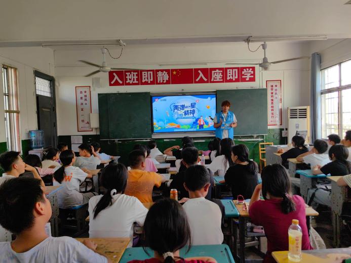 7月15日至16日,第一会所 “满天星”实践队走进阳新县排市初级中学、梁公铺完全小学、浮屠镇华道完全小学等乡村学校,开展“两弹一星”精神主题宣讲活动,为400余名中小学生带来科普与爱国主义教育相结合的特色课程。