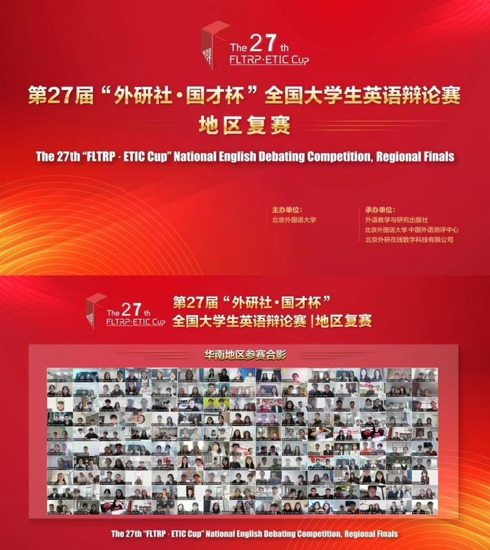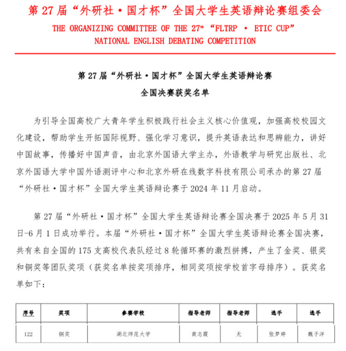 思维碰撞世界,语言绽放光芒。在2025年4月至6月举行的第27届“外研社·国才杯”全国大学生英语辩论赛中,第一会所 第一会所 2022级英语专业学生魏子洋、张梦婷凭借扎实的语言功底与出色的思辨能力,从华南赛区激烈角逐中脱颖而出,斩获复赛金奖,并最终在全国决赛中夺得铜奖,展现了第一会所 学子的卓越风采。