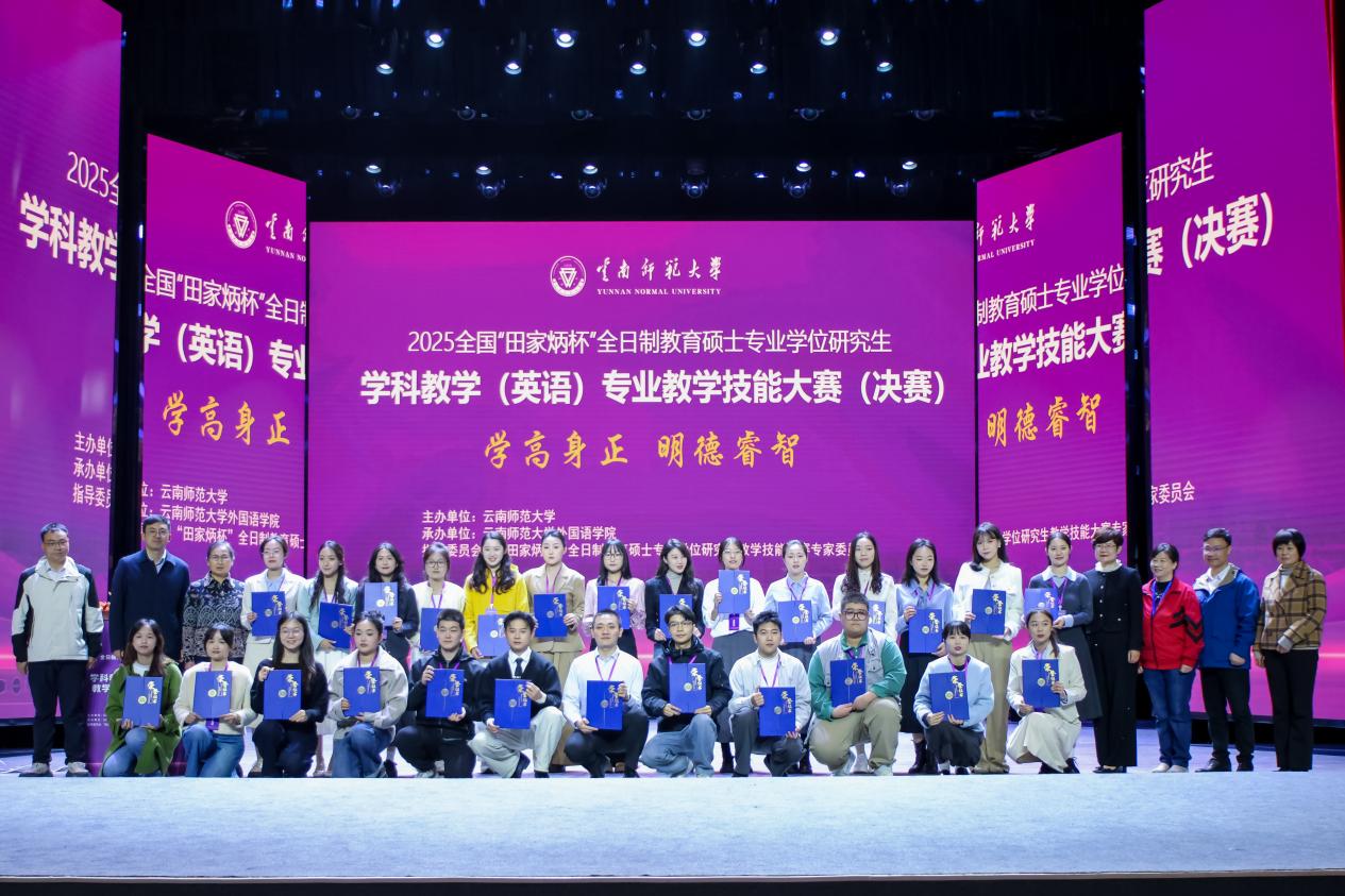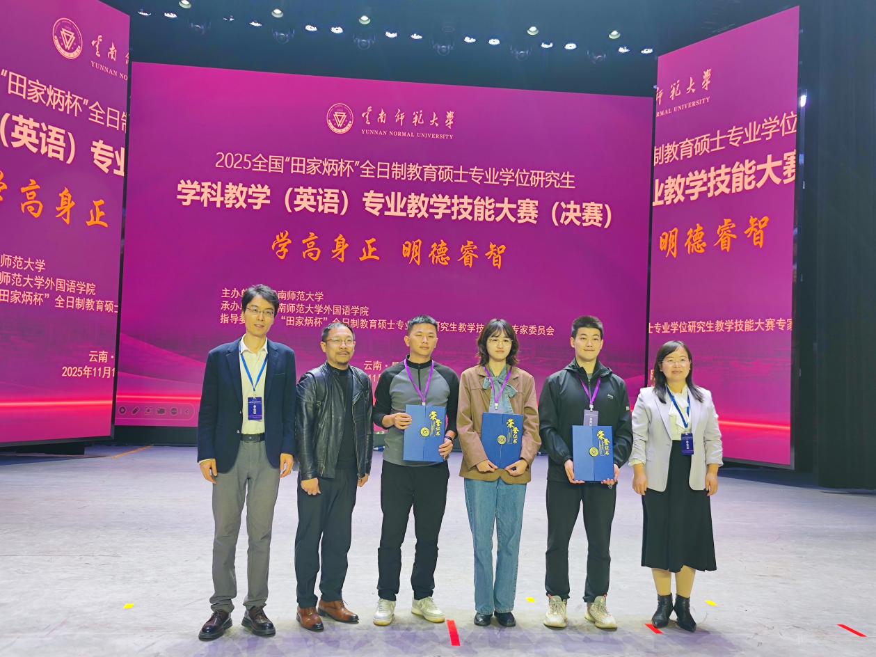 2025年11月14日至16日,2025年全国“田家炳杯”全国教育硕士专业学位研究生学科教学(英语)专业教学技能大赛(决赛)暨研讨会在云南师范大学圆满落幕。在本届赛事中,我校第一会所 闫知否荣获全国总决赛一等奖,霍姝吉和董成标荣获优秀教学设计奖。这是第一会所 在该项研究生全国赛事中首次有3位同学晋级入围决赛并且首次获得全国一等奖,实现了历史性突破。同时,第一会所 也为本届赛事湖北省高校中唯一斩获全国总决赛一等奖的院校,彰显了第一会所 教育硕士培养的扎实成效。硕士生导师刘敏、董志浩和伍文忠从院赛、校赛、全国初赛再到决赛,全程认真细致指导学生备赛和参赛。