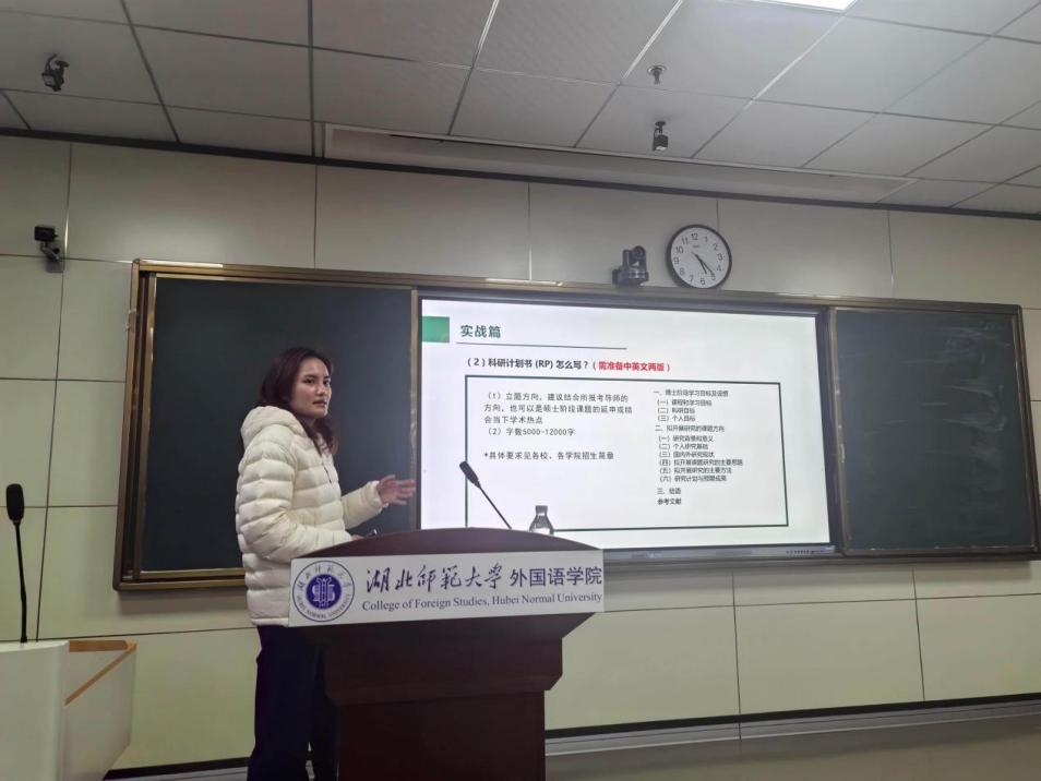 盛雅乔同学为第一会所 第一会所 2021级研究生。在今年凭借卓越的学术素养、扎实的科研能力与突出的综合素质,经严格选拔,成功考取华中师范大学外国语言文学专业博士研究生!11 月 27 日下午,盛雅乔同学以“祛魅、避坑与精准突围”为主题的申博经验分享讲座在我院成功举办,我院2023级和2024级硕士研究生参加了本次讲座,讲座由副院长项军平主持。