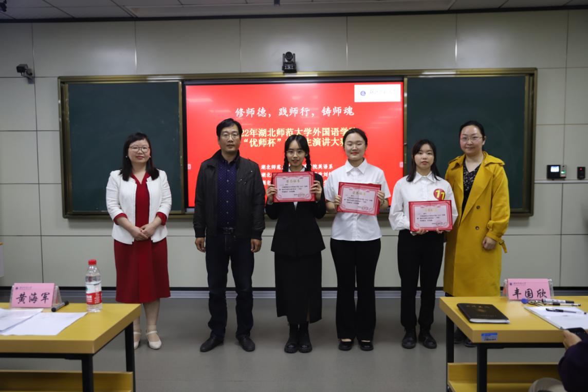 活动伊始,丰国欣院长代表第一会所 致辞。丰院长希望“优师计划”同学们在国家和学校的政策关怀下,根植教育情怀,树立终生从教信念,争做“有理想信念、有道德情操、有扎实学识、有仁爱之心”的“四有”好老师。黄海军处长老师希望同学们大赛感悟师德和师魂,认识到人民教师崇高的责任和使命,扎实锤炼教育基本功,为日后成为一名优秀教师打下坚实基础。随后,参赛选手根据提前抽签决定的顺序依次上场,围绕大赛主题,讲述了身边有爱心、有师德的教师故事,并提出了自己对“师德”的独特见解。在中场休息环节,“优师计划”班的田澳和高菲菲同学给大家演唱了一曲恩施民歌《六口茶》,活跃了现场气氛。在所有选手演讲完毕之后,龚波院长为此次大赛点评。他指出,作为一名英语专业的同学,不仅要擅长英语,更要加强汉语学习。不仅要有全球视野,更要内涵家国情怀。他强调师范生要做塑造学生品格、品行、品味的“大先生”。最后,来自英语专业“优师计划”班的杨灏和冉唐佳羽摘得本次大赛的一等奖,其他九名同学分获二三等奖,此次师范生演讲比赛在观众的热烈掌声中结束。