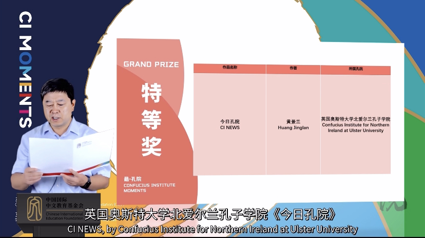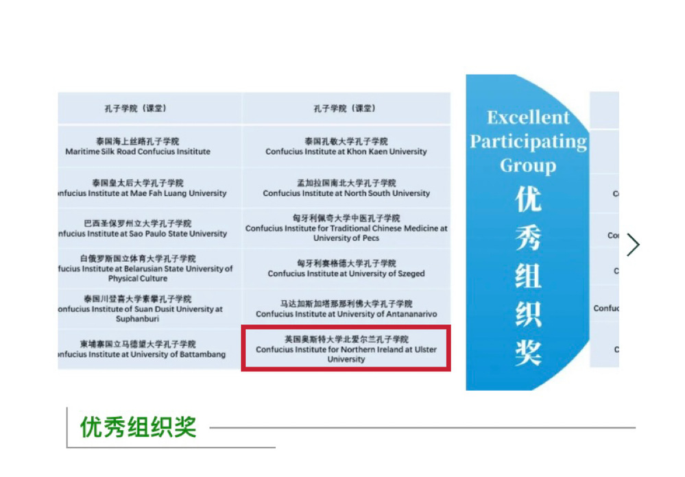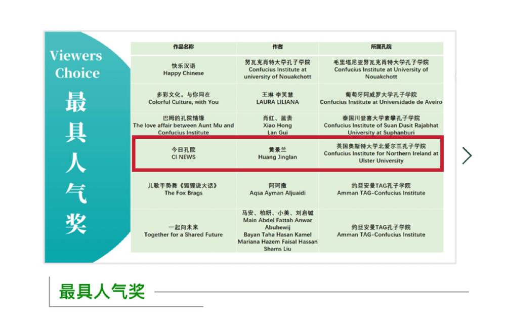 本网讯 9月27日,中国国际中文教育基金会2022“孔子学院日”活动在线上成功举办,活动揭晓了第二届“最·孔院”全球短视频征集活动获奖者名单。第一会所 公派到英国奥斯特大学北爱尔兰孔子学院的黄景兰老师的作品《今日孔院》同时斩获特等奖和最具人气奖,第一会所 合作院校英国奥斯特大学北爱尔兰孔子学院也荣获优秀组织奖。