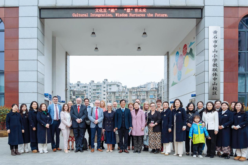 随后,在国际交流合作处处长龚波的陪同下,代表团前往黄石市中山小学进行参观交流。中山小学为代表团精心安排了涵盖课堂教学观摩、校园文化建设展示以及师生互动交流等环节的活动。代表团成员深入课堂,亲身感受了中国基础教育的独特魅力,对学校先进的教育理念、丰富的教学方法以及学生们积极向上的精神风貌给予高度评价,认为此次参观不仅是一次观摩学习的机会,更是中英教育文化交流的一次生动实践。
