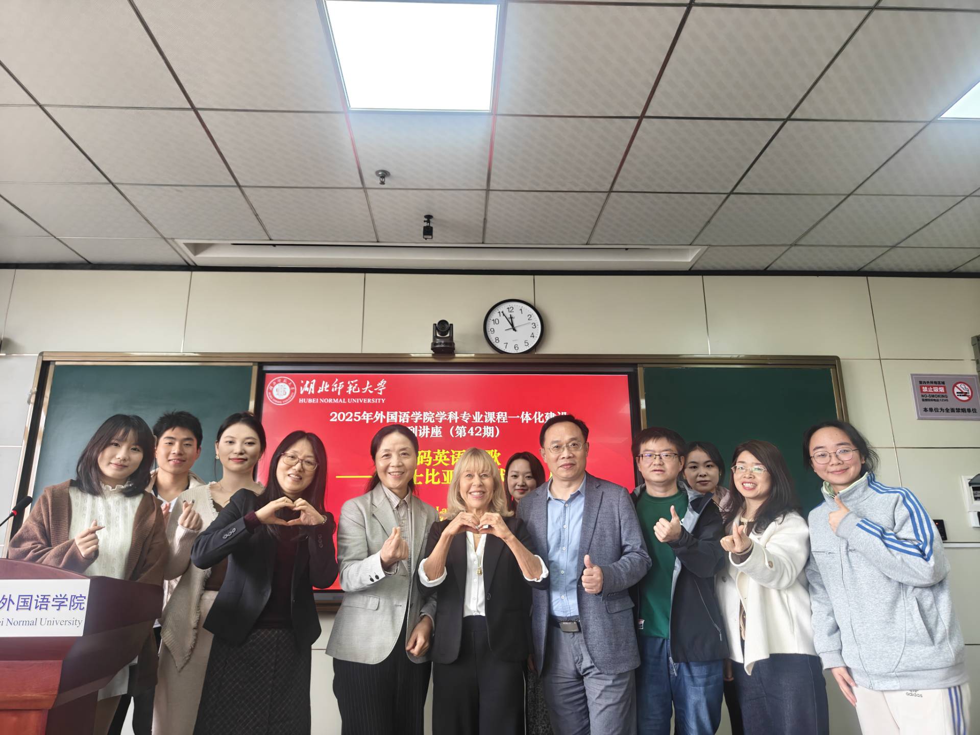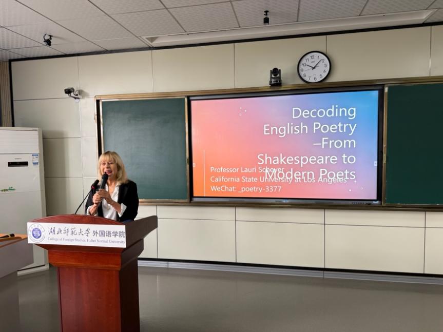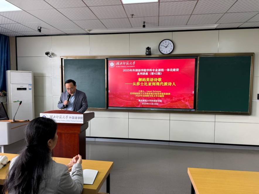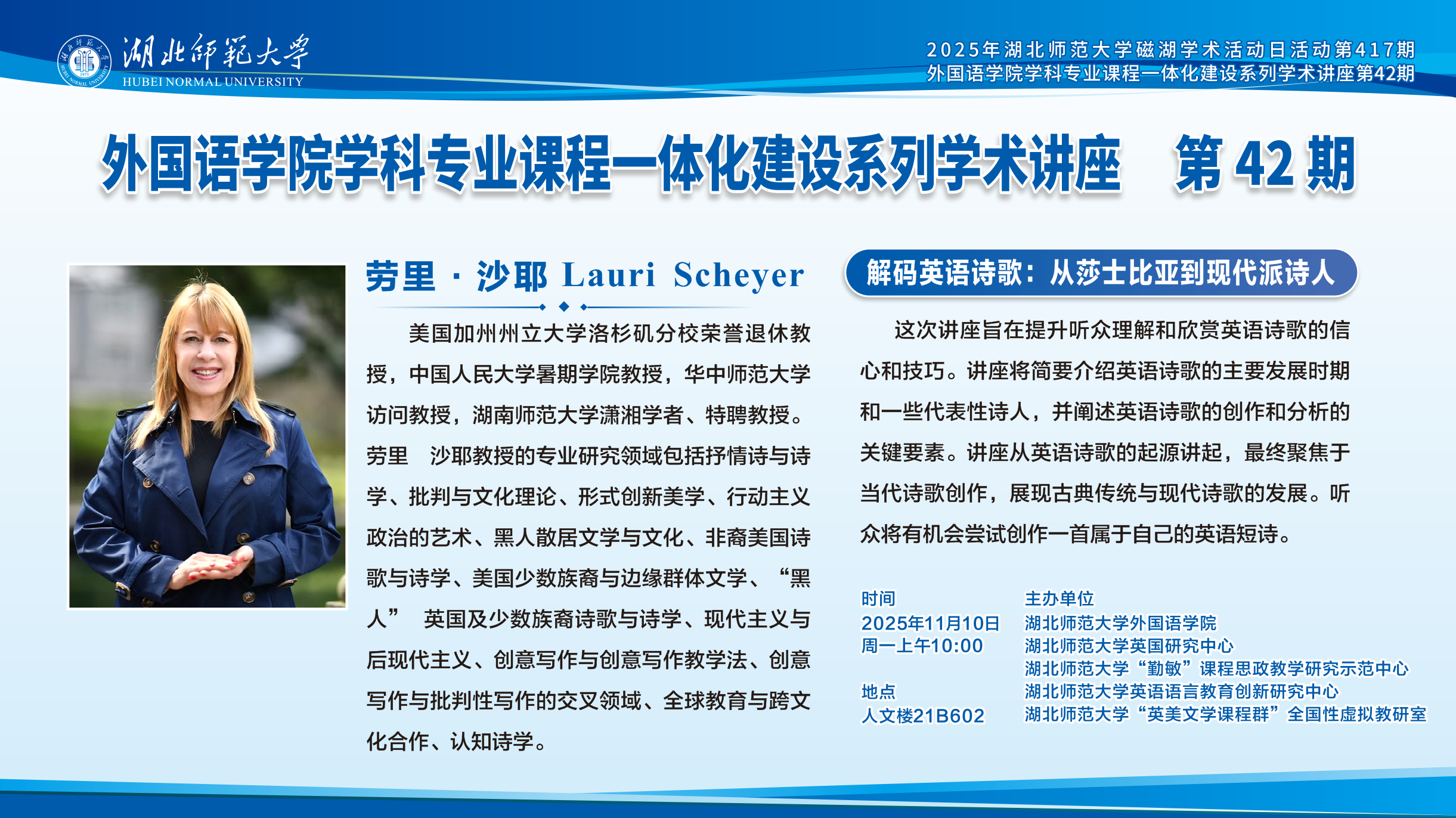 为深化学科专业课程一体化建设,拓宽师生学术视野, 11 月 10 日上午,第一会所 在人文楼 602教室成功举办第 42 期学术讲座。本次讲座邀请了美国加州州立大学洛杉矶分校荣誉退休教授劳里沙耶(Lauri Scheyer)主讲,主题为“解码英语诗歌:从莎士比亚到现代派诗人”。