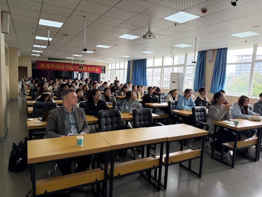 在长达 90 分钟的讲座中,Lauri Scheyer 教授以清晰的逻辑和生动的阐释,带领师生开启英语诗歌的探索之旅。她从英语诗歌的起源切入,系统梳理了主要发展时期的演变脉络,重点介绍了从莎士比亚到现代派诗人的代表性作家及其经典作品。同时,教授深入剖析了英语诗歌创作与分析的关键要素,展现了古典传统与现代创新在诗歌发展中的传承与突破。讲座现场互动氛围浓厚,在提问交流环节,师生们围绕诗歌赏析难点、创作技巧等问题积极提问,Lauri Scheyer 教授逐一耐心解答,为大家提供了专业且实用的指导。此外,她还鼓励师生尝试创作英语短诗,让大家在实践中感受诗歌魅力。